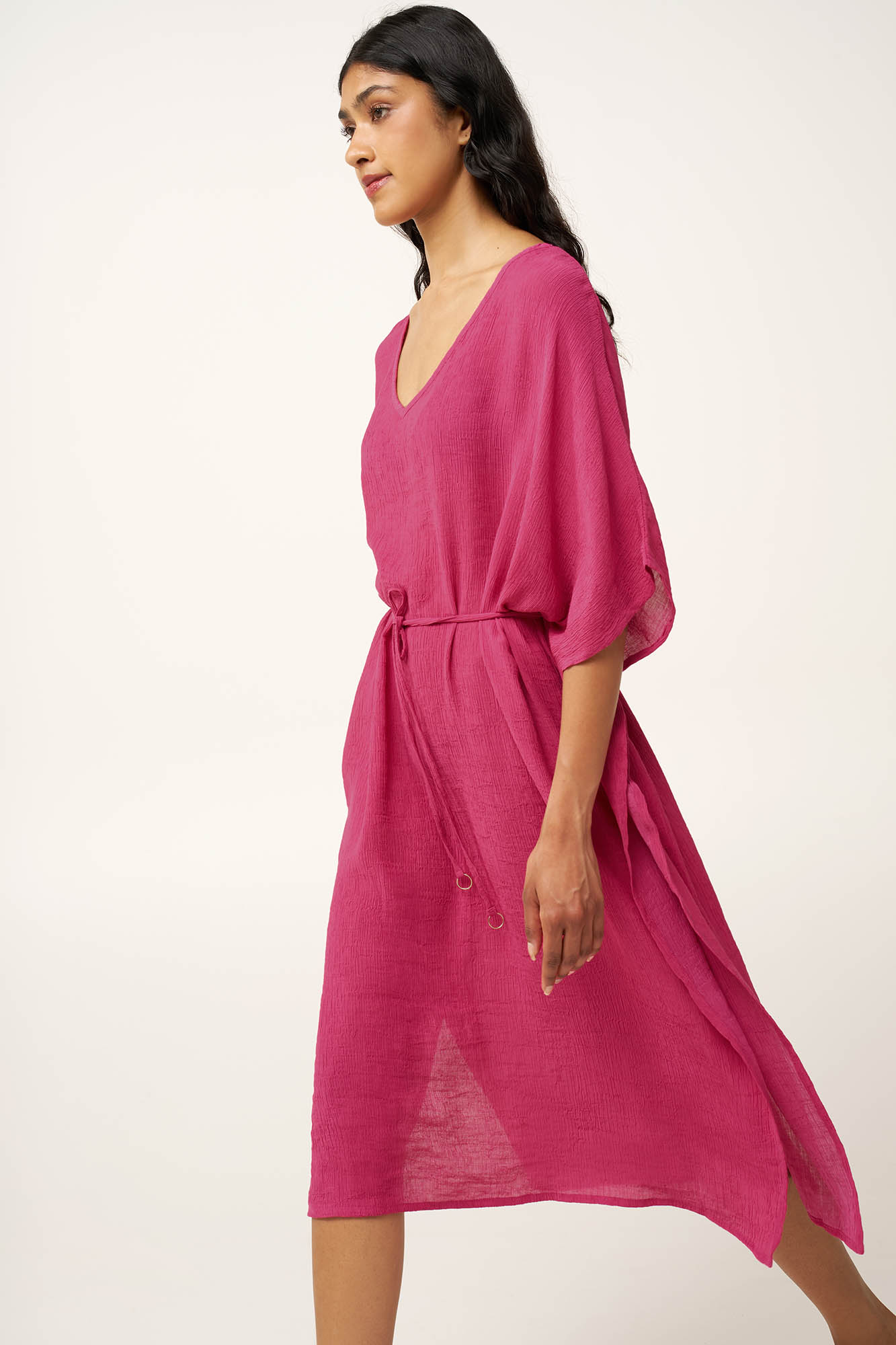 Προσθέστε στην γκαρνταρόμπα σας αυτό το ελαφρύ καλοκαιρινό φόρεμα, κατασκευασμένο από μείγμα γάζας viscose που δημιουργεί μια ρευστή, σχεδόν διάφανη υφή και χαρίζει αίσθηση ελευθερίας. Τα μακριά, αέρινα μανίκια προσθέτουν κίνηση σε κάθε βήμα, ενισχύοντας τη χαλαρή, καλοκαιρινή του διάθεση. Ιδανικό για να φορεθεί πάνω από μαγιό, αποτυπώνει την ανεμελιά των ξέγνοιαστων ημερών στην παραλία και των ηλιόλουστων στιγμών, με διακριτική και φυσική κομψότητα.
