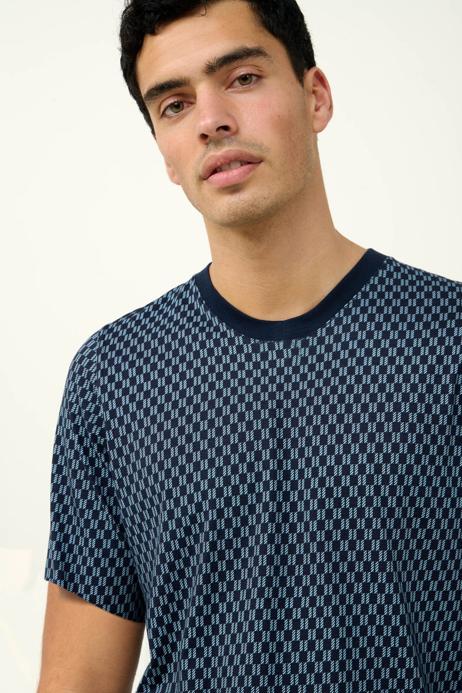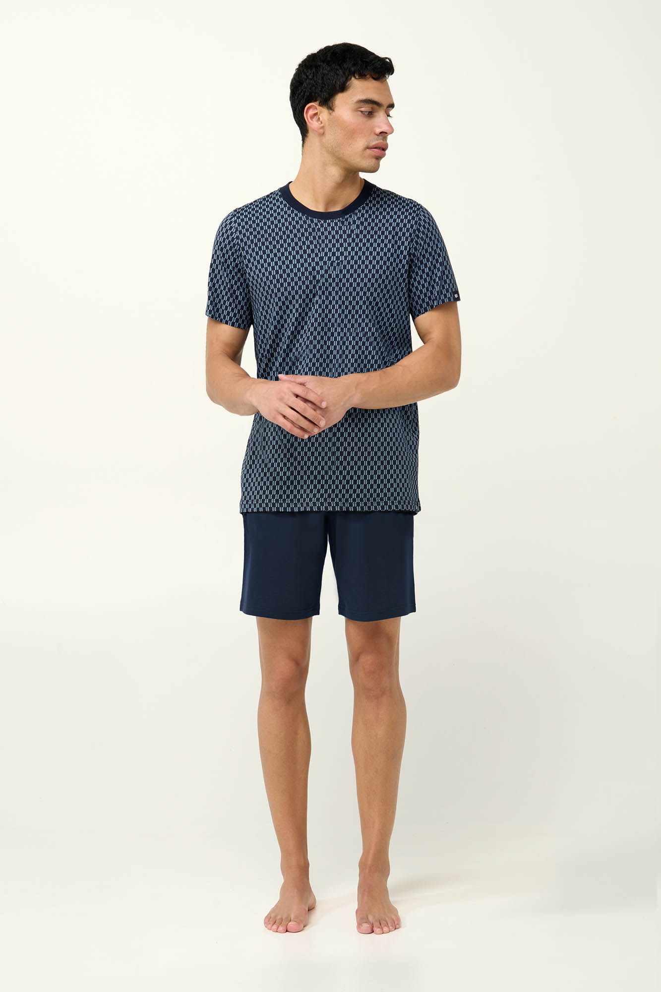 Ανανεώστε την γκαρνταρόμπα σας με αυτό το ανδρικό σετ πυτζάμες, φτιαγμένο από 100% βαμβάκι s.jersey για μοναδική άνεση και διαπνοή. Το χαλαρό μπλουζάκι σε γεωμετρικό μοτίβο, με στρογγυλή λαιμόκοψη ξεχωρίζει χάρη στα κοντά μανίκια, ενώ το μονόχρωμο κοντό παντελόνι προσφέρει ισορροπία και κομψότητα στο σύνολο. Ιδανικό για στιγμές χαλάρωσης ή τον βραδινό σας ύπνο.
