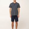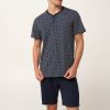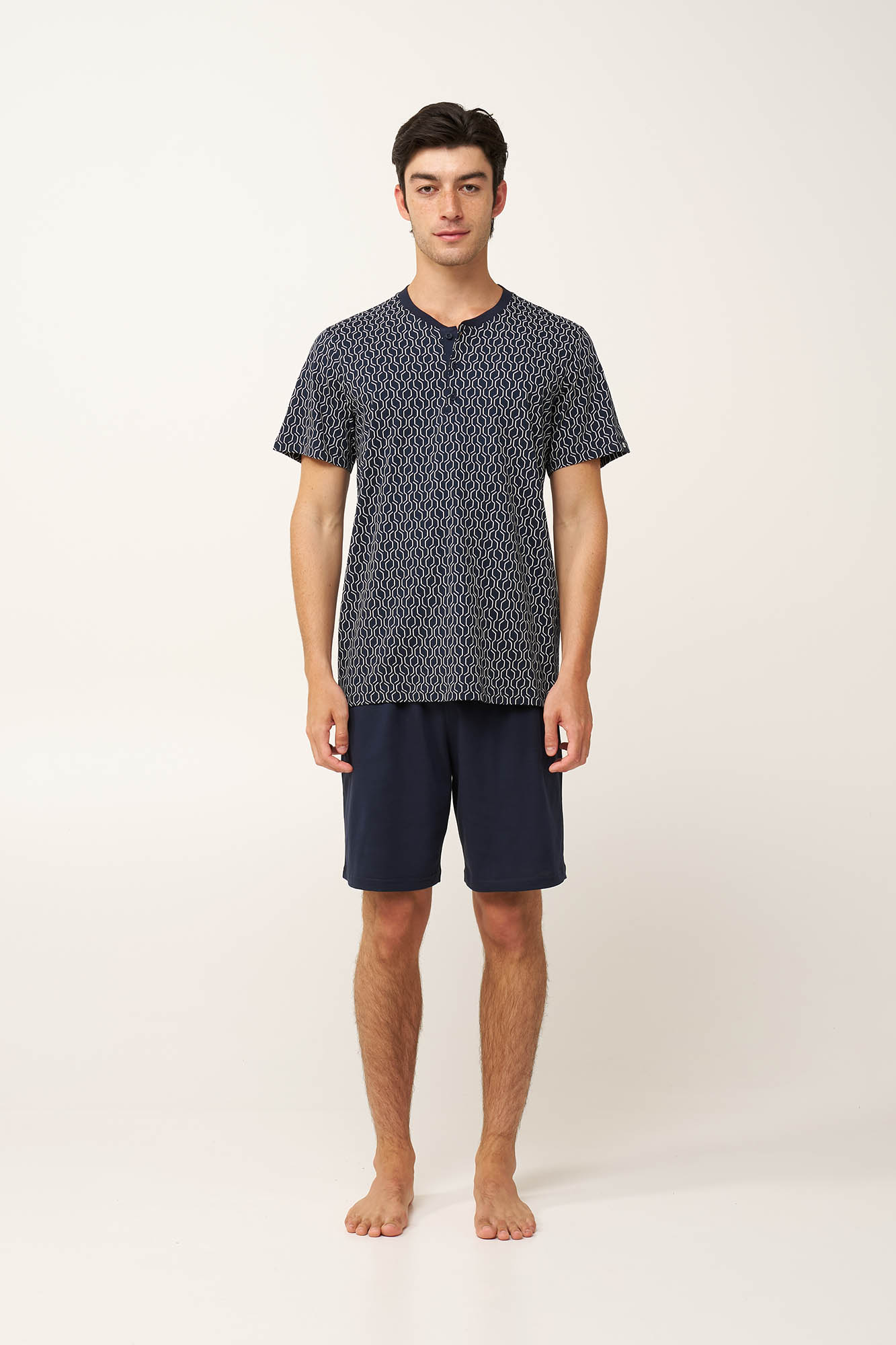 Επιλέξτε την άνεση που σας προσφέρει με αυτό το ανδρικό σετ πυτζάμες, κατασκευασμένο από απαλό και δροσερό 100% βαμβάκι single jersey για ελαφριά και ευχάριστη αίσθηση στο δέρμα. Η κοντομάνικη μπλούζα διαθέτει πατιλέτα με κουμπιά και διακριτικό γεωμετρικό μοτίβο κυμάτων, ενώ το μονόχρωμο παντελόνι ολοκληρώνει το σύνολο αρμονικά το σύνολο. Σχεδιασμένο για χαλάρωση μετά από μια μεγάλη ημέρα και έναν άνετο ύπνο.