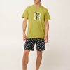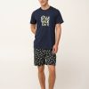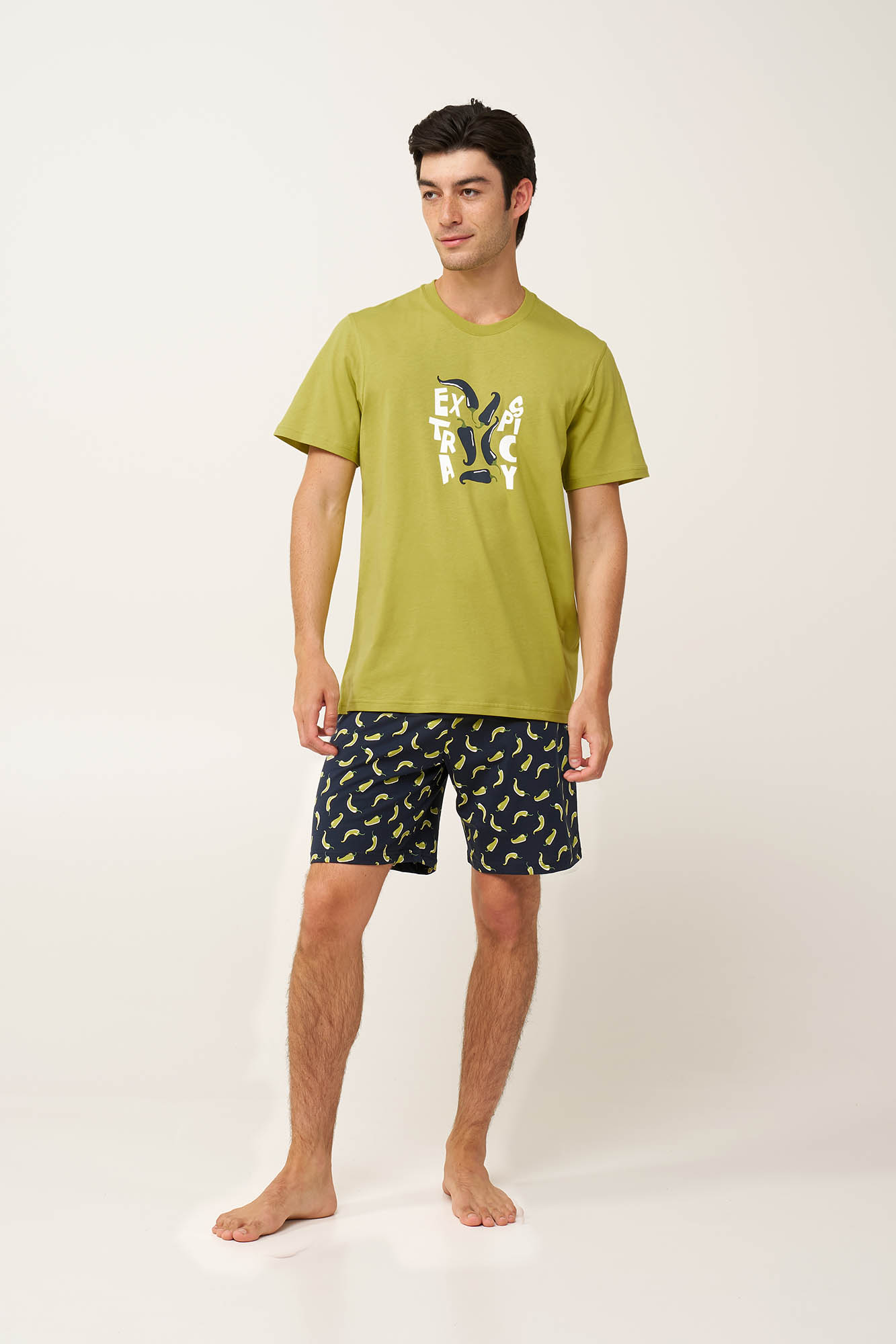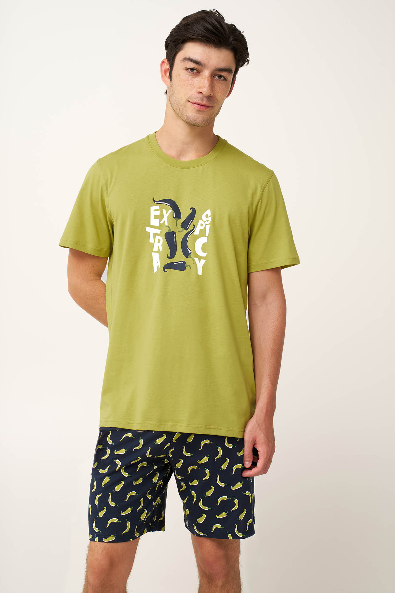 Προσθέστε μια πικάντικη νότα στο καλοκαίρι σας με αυτό το ανδρικό σετ πυτζάμες, κατασκευασμένο από 100% βαμβακερό single jersey με απαλή και διαπνέουσα αίσθηση στο σώμα. Η μπλούζα με στρογγυλή λαιμόκοψη διαθέτει τύπωμα «Extra Spicy» στο στήθος, ενώ το σορτς είναι διακοσμημένο με ζωηρές πρασινοκίτρινες πιπεριές πάνω σε βαθύ ναυτικό φόντο. Σχεδιασμένο για ελευθερία κινήσεων και άνεση όλη τη νύχτα, είναι ιδανικό για καλοκαιρινά βράδια, συνδυάζοντας παιχνιδιάρικο στυλ με πρακτική, χαλαρή εφαρμογή.