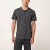 Χαρίστε άνεση και διαχρονικό χαρακτήρα στις ημέρες σας με αυτό το σετ καλοκαιρινές ανδρικές πυτζάμες, κατασκευασμένο από 100% βαμβάκι single jersey που χαρίζει ανάλαφρη και δροσερή αίσθηση. Διαθέτει τοπ με κλασική πατιλέτα και διακριτικό μοτίβο εμπνευσμένο από τη φύση, με μινιμαλιστικές πράσινες και λευκές φόρμες διάσπαρτες σε βαθύ γκρι φόντο. Συνδυάζεται με μονόχρωμο κοντό παντελόνι με χαλαρή εφαρμογή. Ιδανικό για ξεκούραστο ύπνο και ήρεμες στιγμές στο σπίτι.