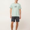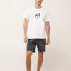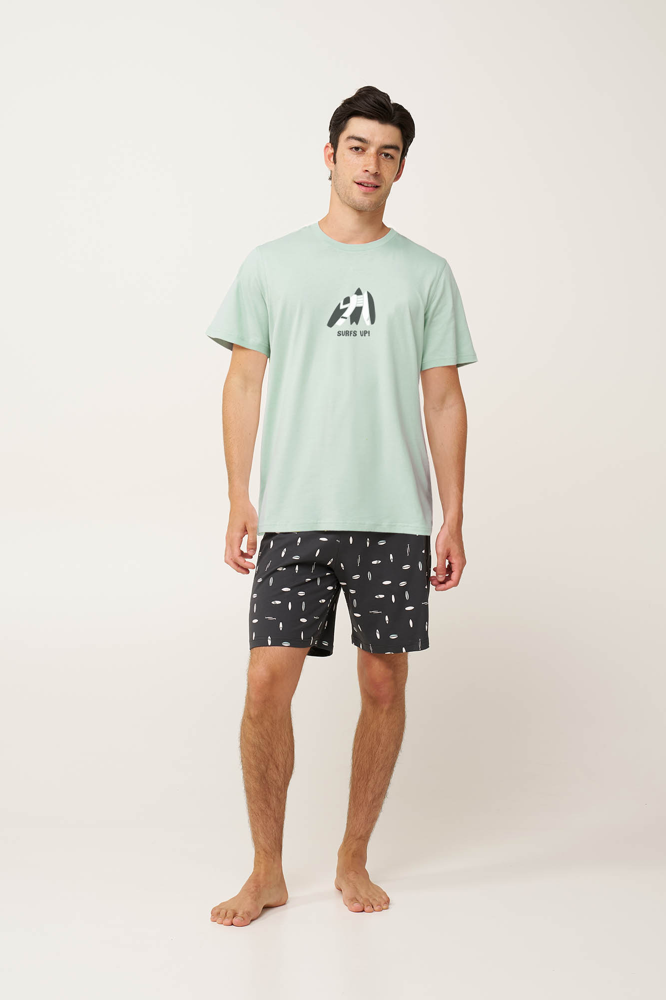 Χαρίστε μια νότα παραθαλάσσιας δροσιάς στις στιγμές χαλάρωσής σας με αυτό το ανδρικό σετ πυτζάμες, κατασκευασμένο από 100% βαμβάκι single jersey για φυσική άνεση και διαπνοή. Η λευκή μπλούζα με στρογγυλή λαιμόκοψη διαθέτει τύπωμα με σανίδας του surf στο στήθος. Συνδυάζεται με κοντό παντελόνι διακοσμημένο με μίνιμαλ σχέδια σανίδων σε off-white και απαλό γαλάζιο πάνω σε σκούρο ανθρακί φόντο. Ένα σετ που αποπνέει φρεσκάδα και νεανικό χαρακτήρα.