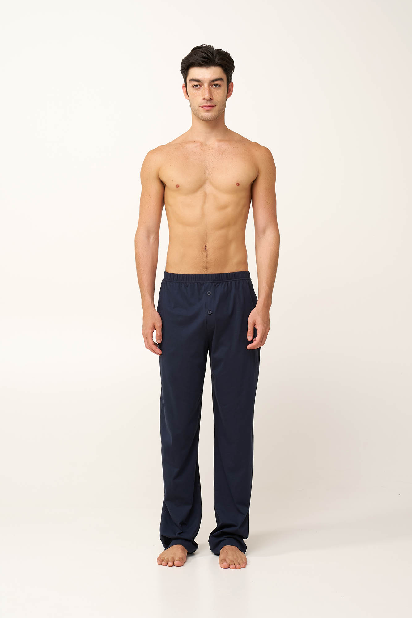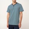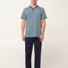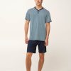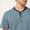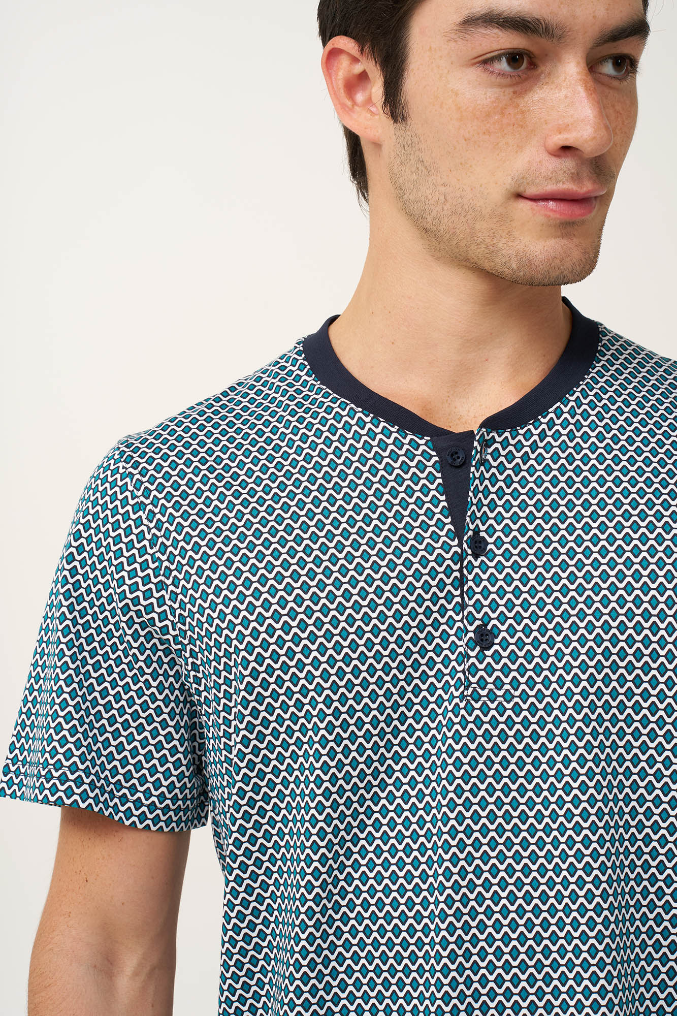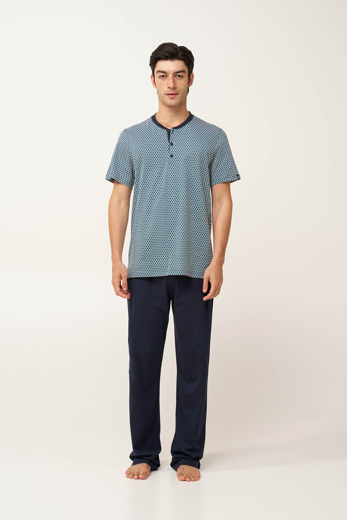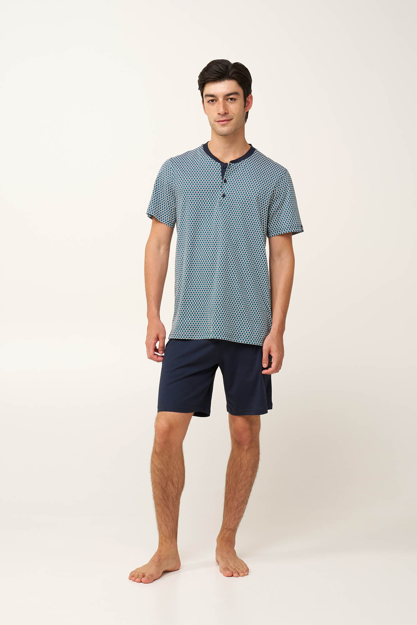 Προσθέστε στην γκαρνταρόμπα σας αυτό το πρακτικό ανδρικό σετ πυτζάμες τριών τεμαχίων, κατασκευασμένο από 100% βαμβάκι single jersey για απαλή, και διαπνέουσα αίσθηση. Αποτελείται από μπλούζα με κλασική πατιλέτα που είναι διακοσμημένη με ένα ρυθμικό γεωμετρικό τύπωμα σε ψυχρούς μπλε τόνους. Το σετ συμπληρώνουν ένα μονόχρωμο κοντό και ένα μακρύ παντελόνι. Φορέστε αυτό που σας εξυπηρετεί από τα ζεστά πρωινά ως τα δροσερά βράδια των διακοπών στη βεράντα.