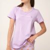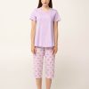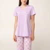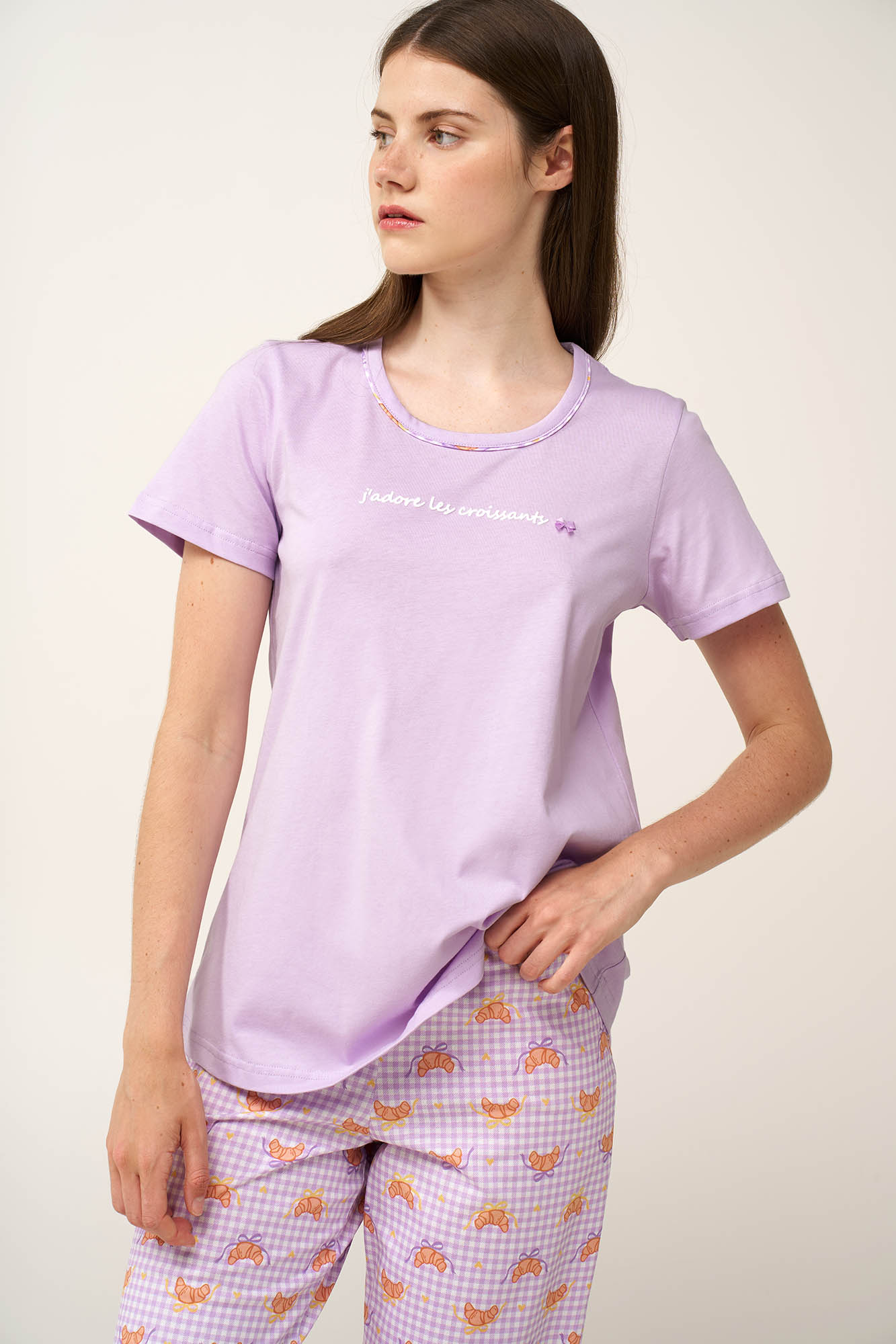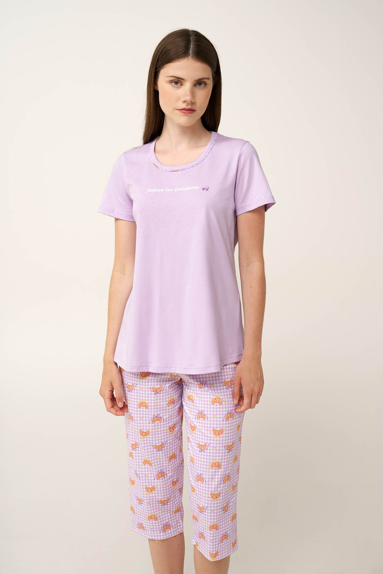 Ανανέωσε την γκαρνταρόμπα σας με αυτό το γυναικείο σετ πιτζάμες, σχεδιασμένο για απόλυτη άνεση τις ζεστές καλοκαιρινές νύχτες. Κατασκευασμένο από απαλό και δροσερό 100% βαμβάκι single jersey. Το σετ αποτελείται από μονόχρωμο λιλά κοντομάνικο τοπ με τύπωμα «I love croissants» στο στήθος, ενώ το κάπρι παντελόνι έχει φρέσκα κρουασάν, σκορπισμένα σε καρό gingham μοτίβο, που προσθέτουν μια γλυκιά και χαριτωμένη πινελιά. Συνδυάζει πρακτικότητα με μια ανάλαφρη, θηλυκή διάθεση, ιδανική για χαλάρωση ή ύπνο.