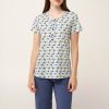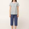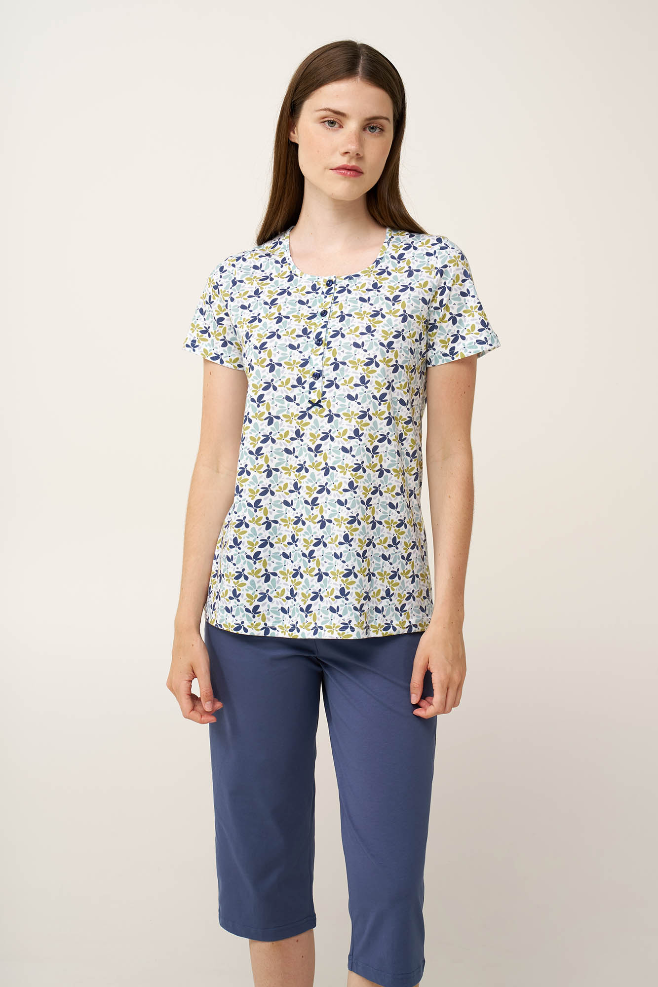 Απολαύστε φυσική καλοκαιρινή άνεση με αυτή τη γυναικεία πυτζάμα, κατασκευασμένη από απαλό και διαπνέον 100% βαμβάκι single jersey. Αποτελείται από τοπ με πατιλέτα σε ένα μοτίβο από φύλλα σε απαλές γήινες αποχρώσεις, που χαρίζει φρεσκάδα και ηρεμία στο σύνολο. Το σετ συμπληρώνει ένα μονόχρωμο κάπρι παντελόνι. Μια πρακτική επιλογή που θα απολαύσετε ένα πρωινό Κυριακής ή το απόγευμα μετά από μια μεγάλη ημέρα.