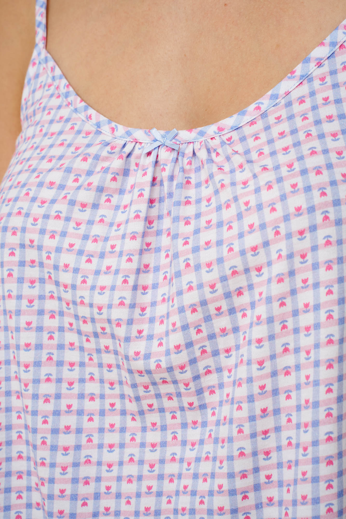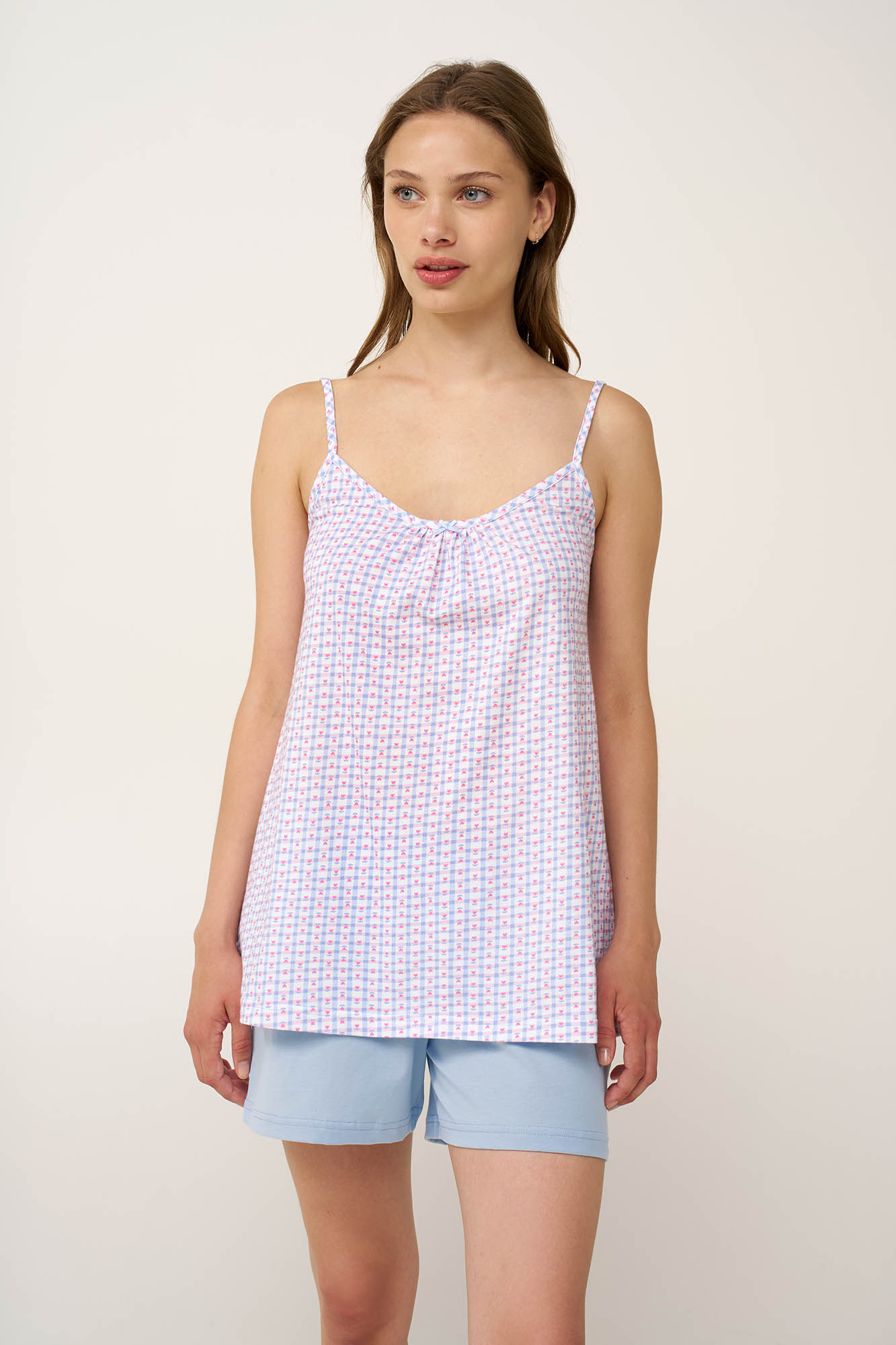 Απολαύστε τις πιο ζεστές ημέρες του καλοκαιριού με αυτό το baby doll, κατασκευασμένο από 100% βαμβάκι single jersey με δροσερή και ανάλαφρη αίσθηση στο σώμα. Αποτελείται από τοπ με λεπτές τιράντες και σούρες στο στήθος σε ένα γοητευτικό καρό μοτίβο με τουλίπες, σε ροζ και μπλε αποχρώσεις. Το σετ συμπληρώνει ένα μονόχρωμο παντελόνι που χαρίζει ισορροπία στο σύνολο. Ιδανική επιλογή για να απολαύσετε ένα απόγευμα στο σπίτι ή ένα χαλαρό πρωινό.