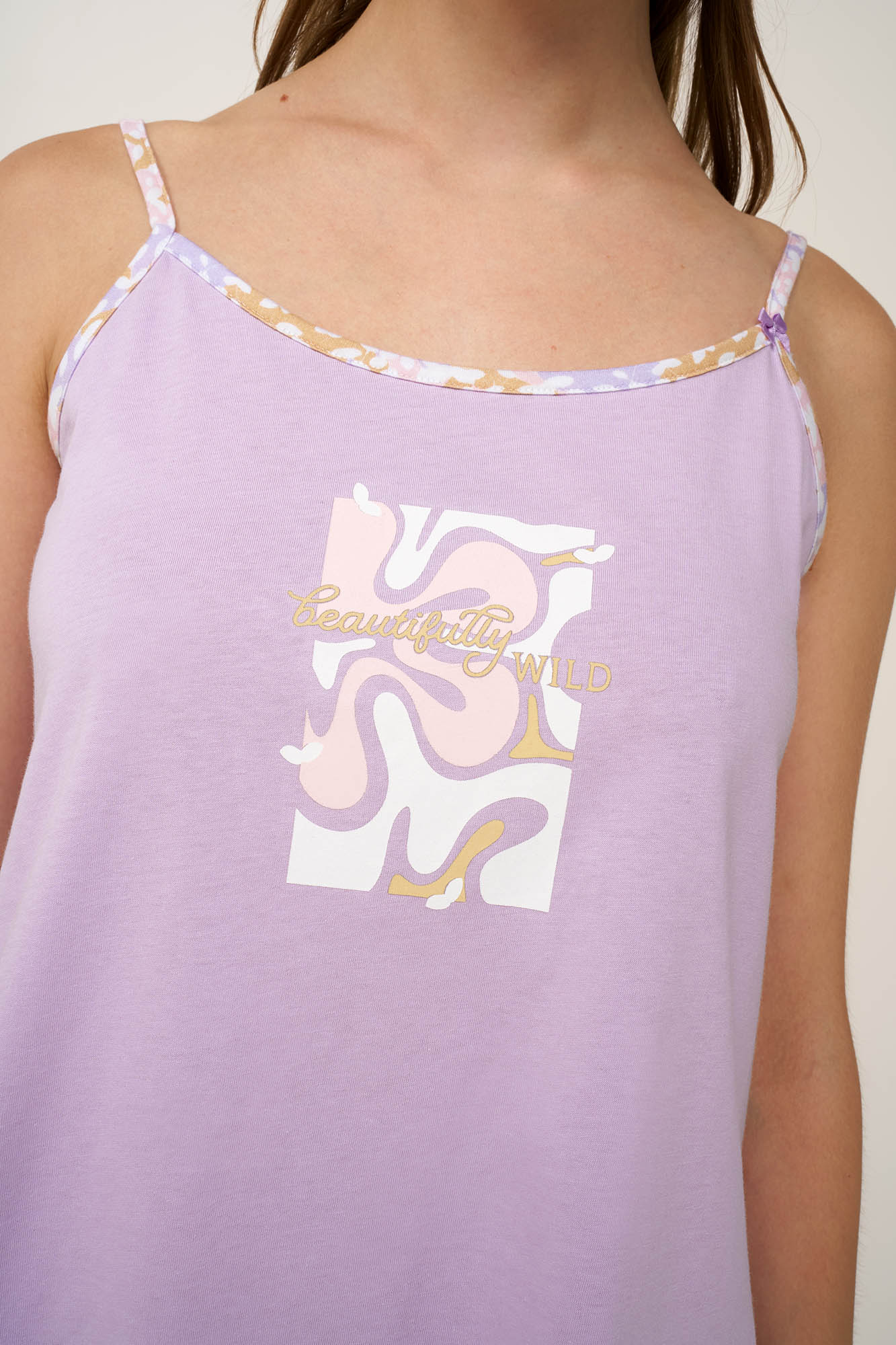 Ανακαλύψτε τον ιδανικό συνδυασμό άνεσης και θηλυκότητας με αυτό το baby doll, κατασκευασμένο από απαλό και διαπνέον 100% βαμβακερό single jersey για ανάλαφρη, δροσερή αίσθηση στο σώμα. Το τοπ με λεπτές τιράντες σε απαλή λιλά απόχρωση χαρίζει ηρεμία και γλύκα, ενώ το ασορτί σορτσάκι με αφηρημένο παστέλ κολάζ print προσθέτει μια παιχνιδιάρικη αντίθεση. Σχεδιασμένο για χαλαρές καλοκαιρινές νύχτες, το σετ προσφέρει άνεση στην κίνηση και ανεπιτήδευτο στυλ, ιδανικό για ξεκούραση στο σπίτι ή για έναν άνετο ύπνο.