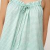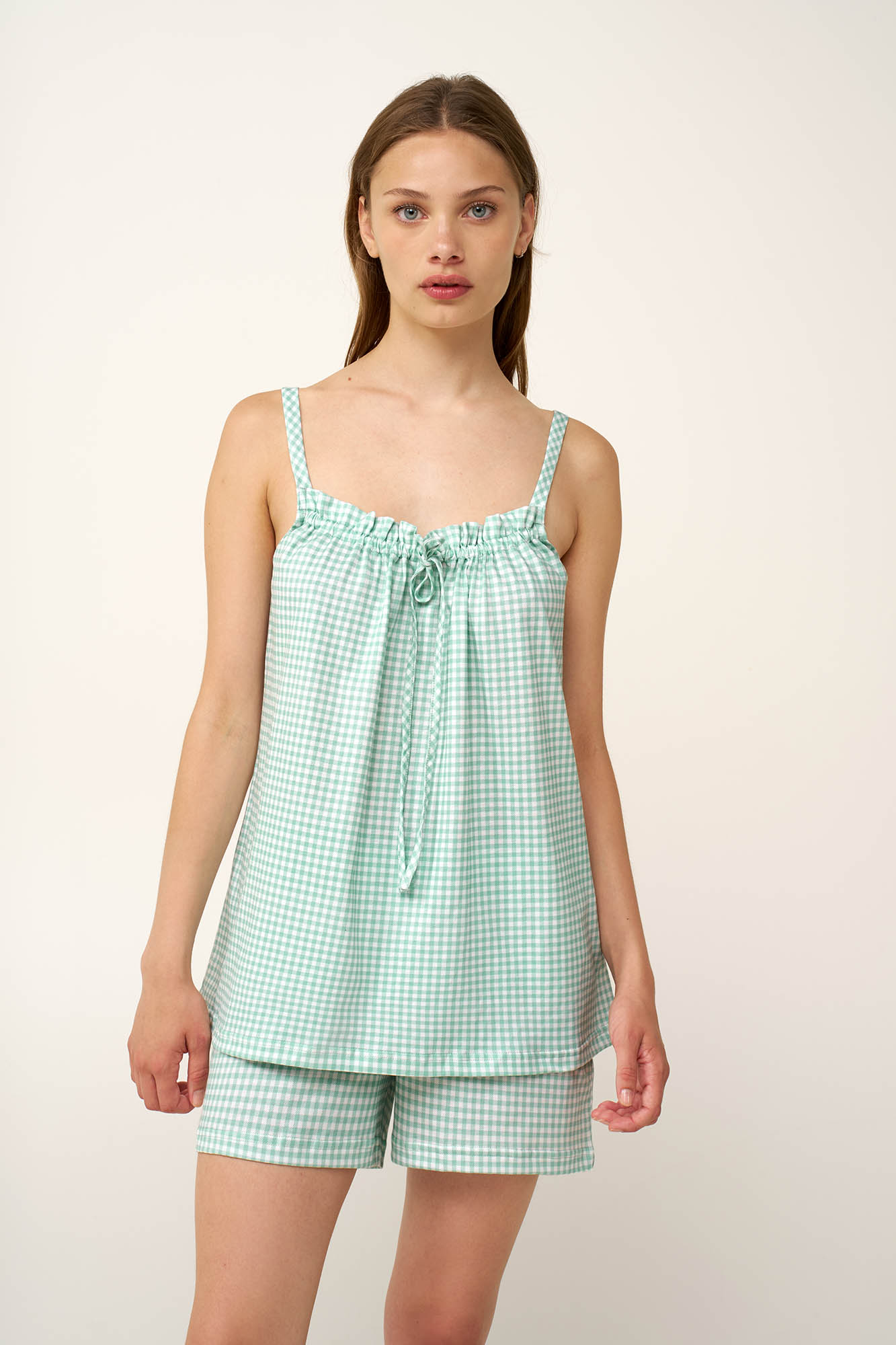 Αφεθείτε στη δροσερή αίσθηση που χαρίζει αυτό το baby doll, κατασκευασμένο από απαλό και διαπνέον 100% βαμβάκι single jersey. Αποτελείται από τοπ με λεπτές τιράντες και τετράγωνη λαιμόκοψη που δένει μπροστά, προσθέτοντας άνεση και βέλτιστη εφαρμογή. Το σετ ολοκληρώνεται με ένα κοντό παντελόνι. Το διαχρονικό καρό gingham μοτίβο που θυμίζει καθαρό ουρανό και θαλασσινή αύρα, αποπνέει γλυκιά, ανάλαφρη και ανεπιτήδευτη γοητεία, ιδανική για χαλάρωση, ξεκούραση ή έναν άνετο ύπνο με έντονα θηλυκή διάθεση.