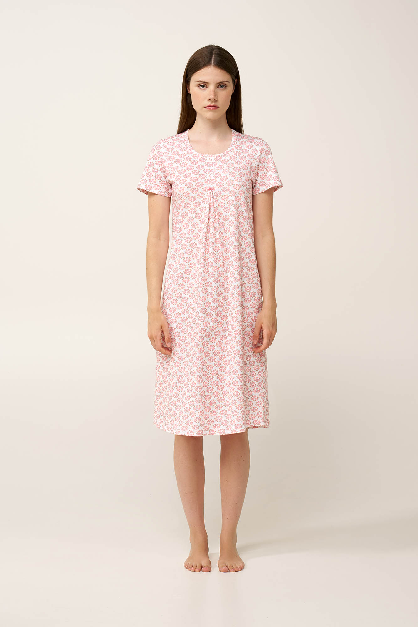 Προσθέστε στη συλλογή σας αυτό το καλοκαιρινό νυχτικό, κατασκευασμένο από απαλό και διαπνέον 100% βαμβάκι single jersey, προσφέροντας ελαφριά και αέρινη αίσθηση. Τα κοντά μανίκια και η διακριτική πιέτα στο μπροστινό μέρος δημιουργούν χαλαρή και άνετη εφαρμογή, ενώ το ρομαντικό μοτίβο από τριαντάφυλλα σε ιβουάρ βάση προσθέτει μια λεπτεπίλεπτη, θηλυκή πινελιά. Απολαύστε κάθε στιγμή του καλοκαιριού με άνεση και γοητεία.
