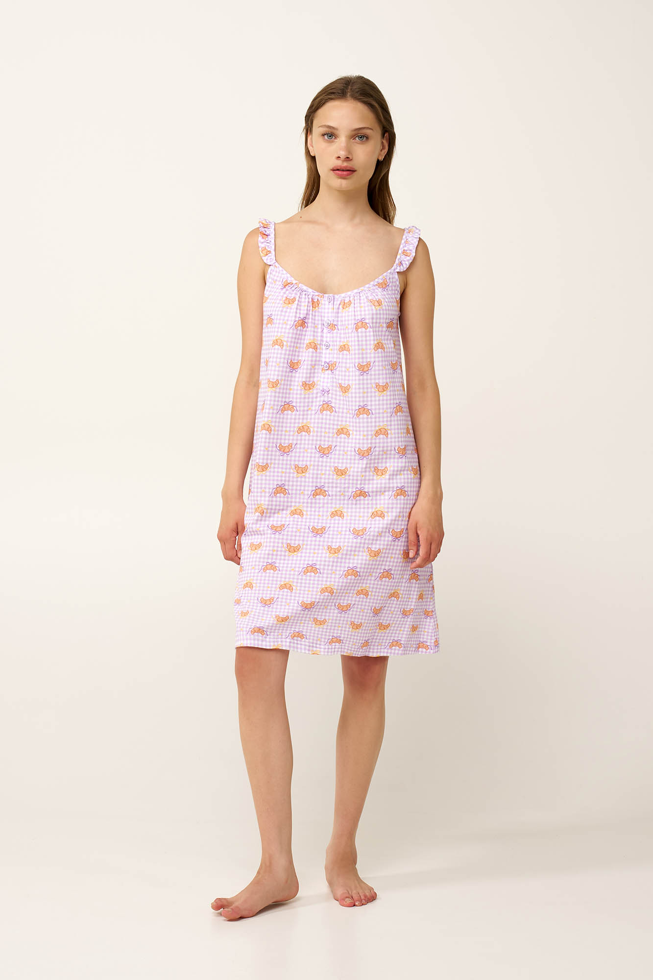 Απολαύστε τις πιο ζεστές ημέρες του καλοκαιριού με αυτό το νυχτικό είναι κατασκευασμένο από διαπνέον 100% βαμβάκι single jersey, προσφέροντας ανάλαφρη και δροσερή αίσθηση στο σώμα. Η πρακτική πατιλέτα το καθιστά κατάλληλο για θηλασμό, ενώ οι λεπτές τιράντες με βολάν και τις διακριτικές σούρες στο στήθος προσθέτουν μια ρομαντική και κομψή πινελιά. Σχεδιασμένο με ένα χαριτωμένο μοτίβο από κρουασάν πάνω σε καρό gingham, χαρίζει μια γλυκιά, cozy διάθεση με μια νότα απόλαυσης.