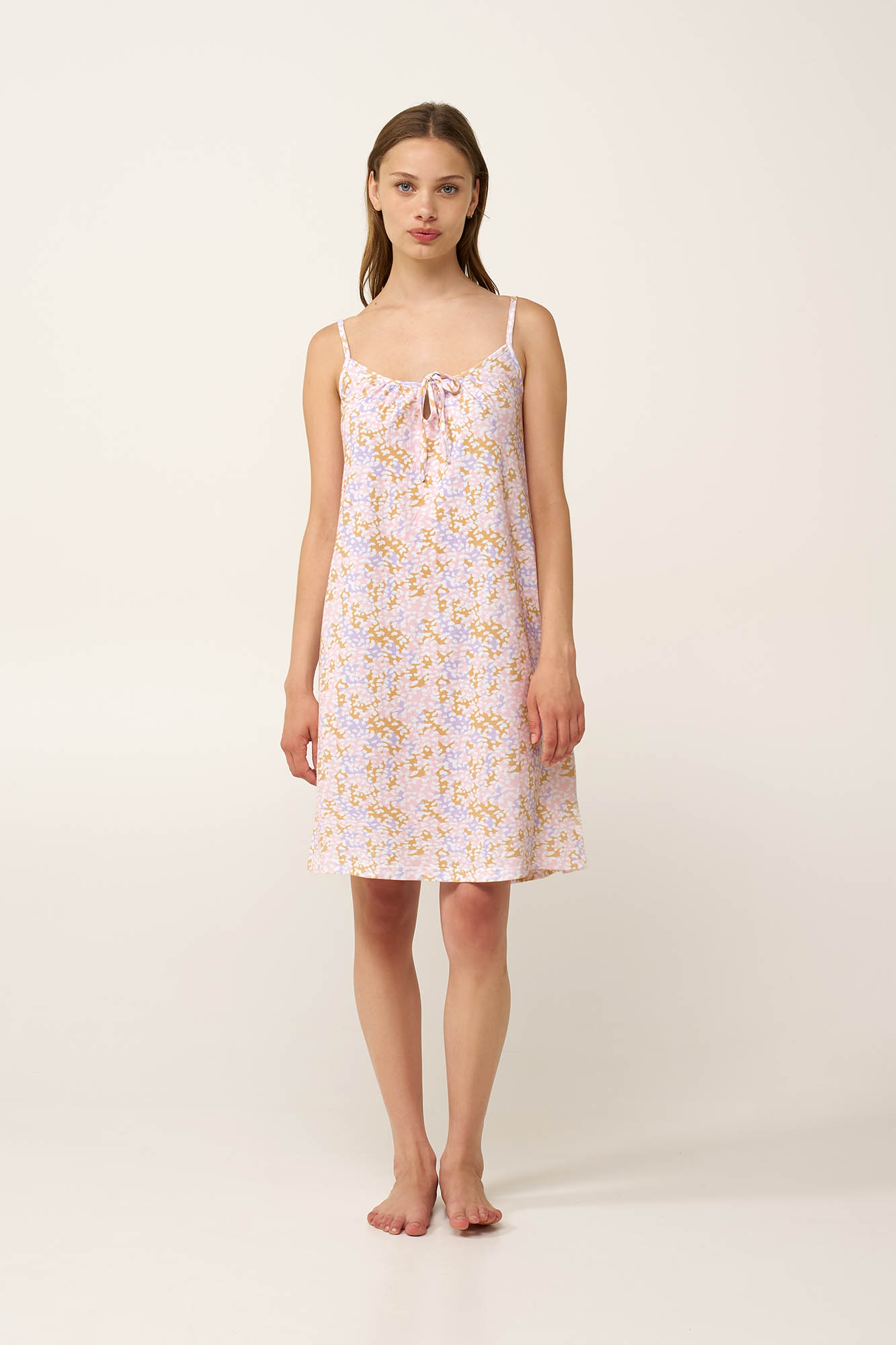 Ανάλαφρο και αβίαστα θηλυκό, αυτό το καλοκαιρινό νυχτικό είναι ιδανικό για ζεστές, χαλαρές νύχτες. Κατασκευασμένο από απαλό και διαπνέον 100% βαμβάκι single jersey, προσφέρει δροσερή αίσθηση στο δέρμα και άνεση όλη τη νύχτα. Οι λεπτές τιράντες και η χαλαρή εφαρμογή δημιουργούν μια κομψή σιλουέτα, ενώ το δέσιμο στο λαιμό προσθέτει μια διακριτική, ρομαντική λεπτομέρεια. Ιδανικό για χαλάρωση, ξεκούραση και στιγμές απόλυτης άνεσης.