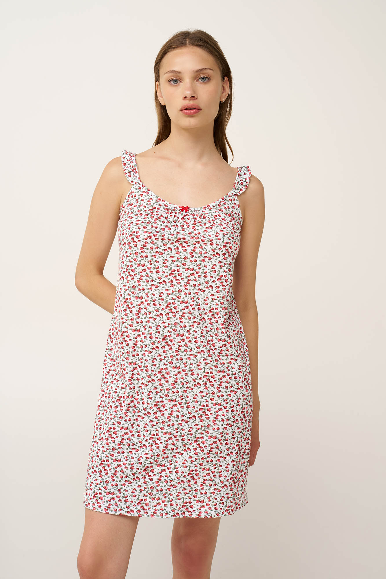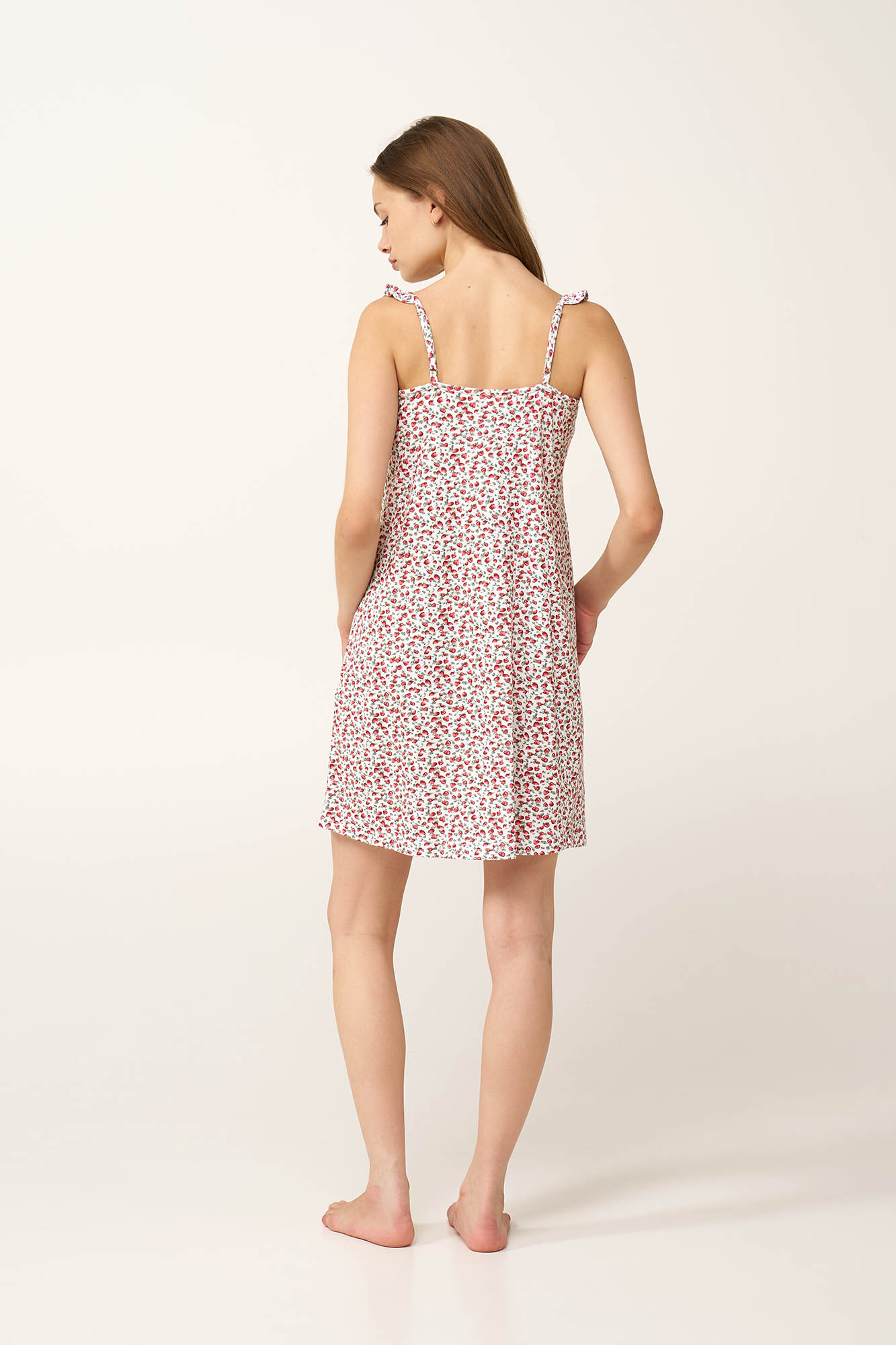 Προσθέστε στην γκαρνταρόμπα σας με το ελαφρύ νυχτικό, κατασκευασμένο από 100% βαμβάκι single jersey για απαλή και διαπνέουσα αίσθηση. Διακοσμημένο με ζουμερές φράουλες σκορπισμένες πάνω σε λευκό καμβά, το σχέδιο αποπνέει φρέσκια, καλοκαιρινή διάθεση εμπνευσμένα από τη γλυκιά φύση. Οι τιράντες με βολάν και οι διακριτικές σούρες στο στήθος δημιουργούν μια θηλυκή, χαλαρή σιλουέτα, προσθέτοντας κίνηση στο σχέδιο. Ένα άνετο, ανάλαφρο νυχτικό, ιδανικό για χαλάρωση στο σπίτι και στιγμές απόλυτης άνεσης.