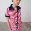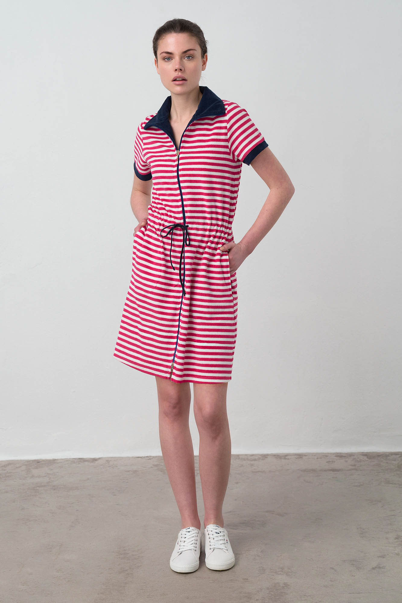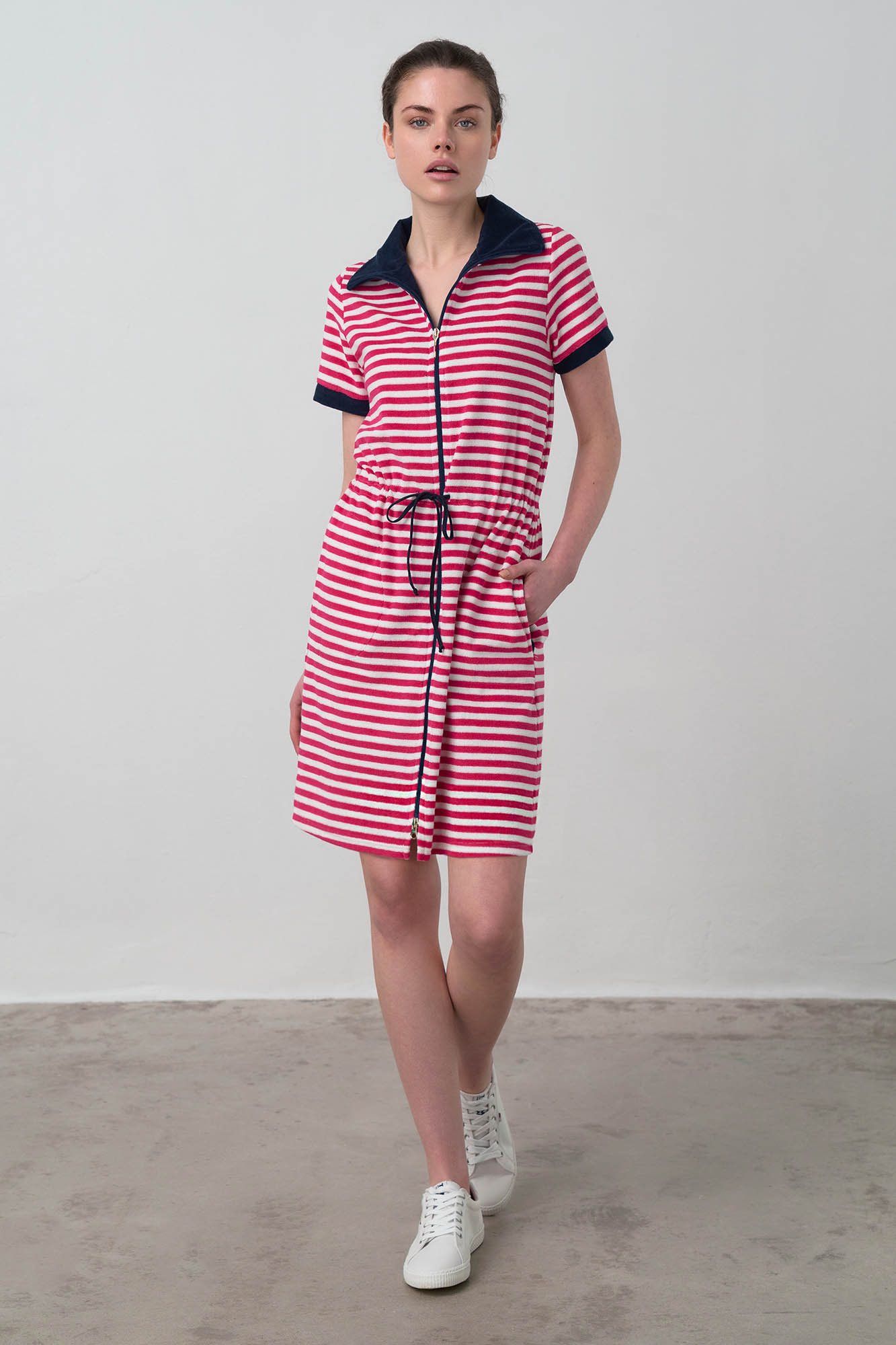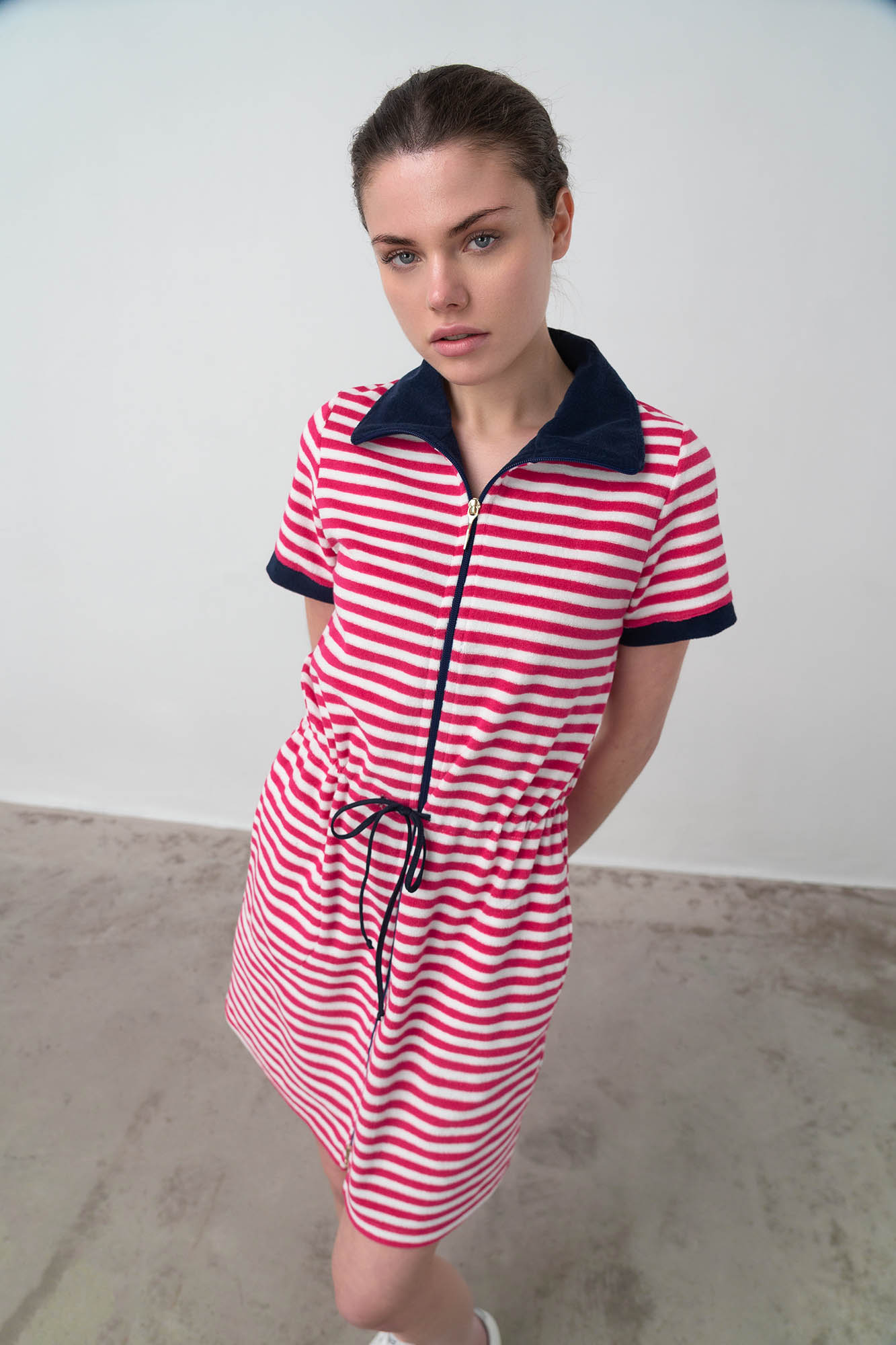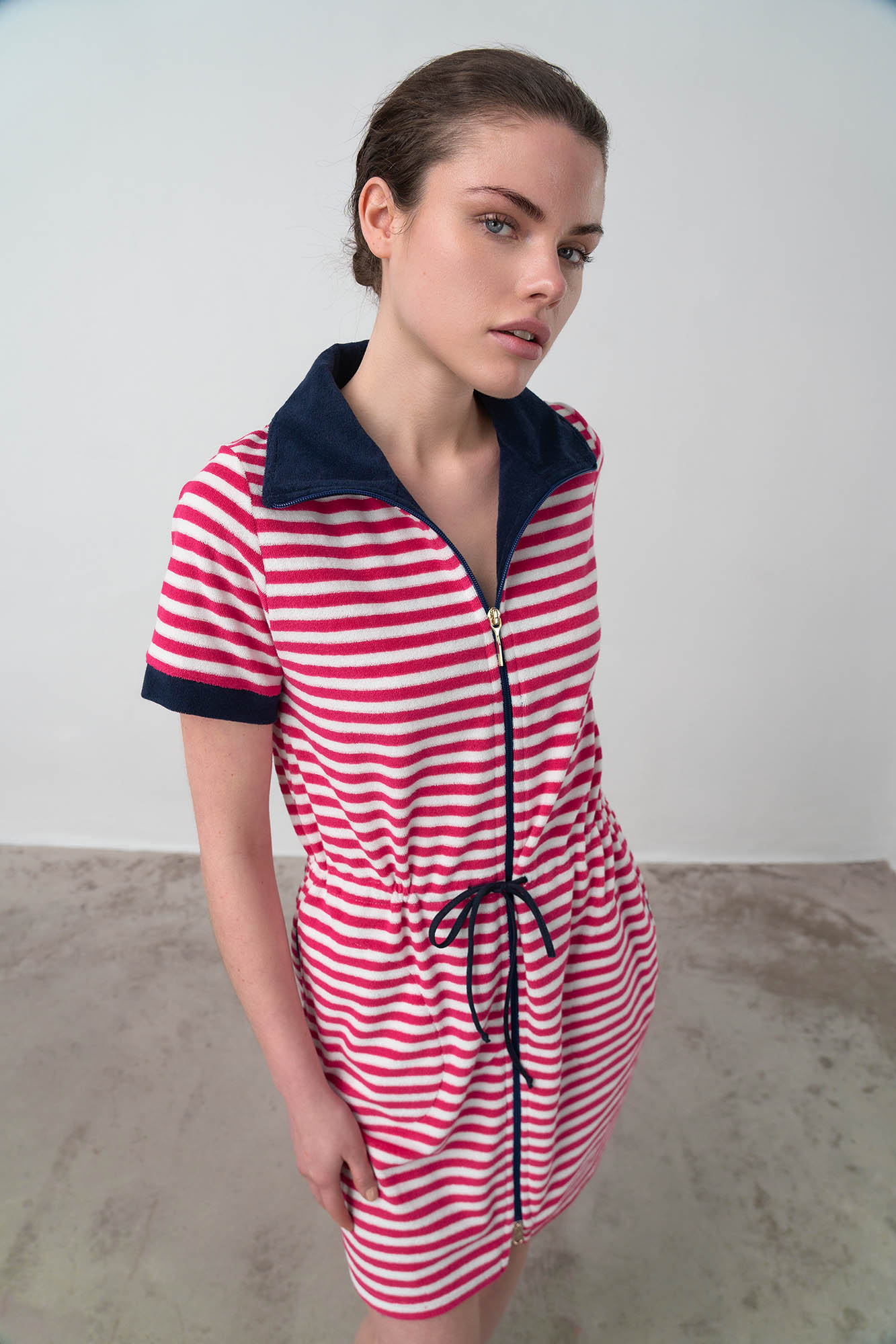 Ριγέ φόρεμα με φερμουάρ, λάστιχο στη μέση και τσέπες στο πλάι. Φτιαγμένο από απαλή πετσέτα, μπορεί να φορεθεί το καλοκαίρι πάνω από το μαγιό.