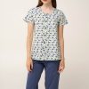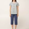 Ανανεώστε τη διάθεση σας με ένα σετ γυναικείες πυτζάμες από απαλό και διαπνέον 100% βαμβάκι single jersey, που θα σας χαρίσει άνεση τις ζεστές καλοκαιρινές ημέρες. Αποτελείται από κουμπωτό τοπ με ένα μοτίβο φύλων σε απαλές γήινες αποχρώσεις και συνοδεύεται από ένα μονόχρωμο κάπρι παντελόνι που ισορροπεί το σύνολο. Ιδανικό για να το βραδινό σας ύπνο ή για να απολαύσετε ένα απόγευμα μετά από μια μεγάλη ημέρα.