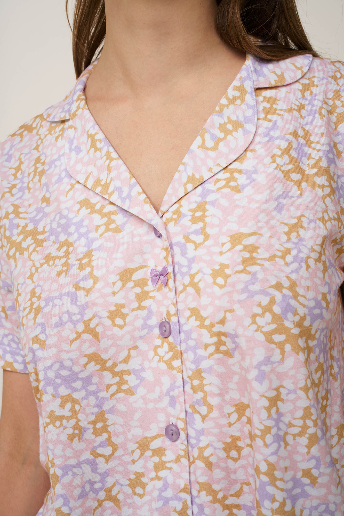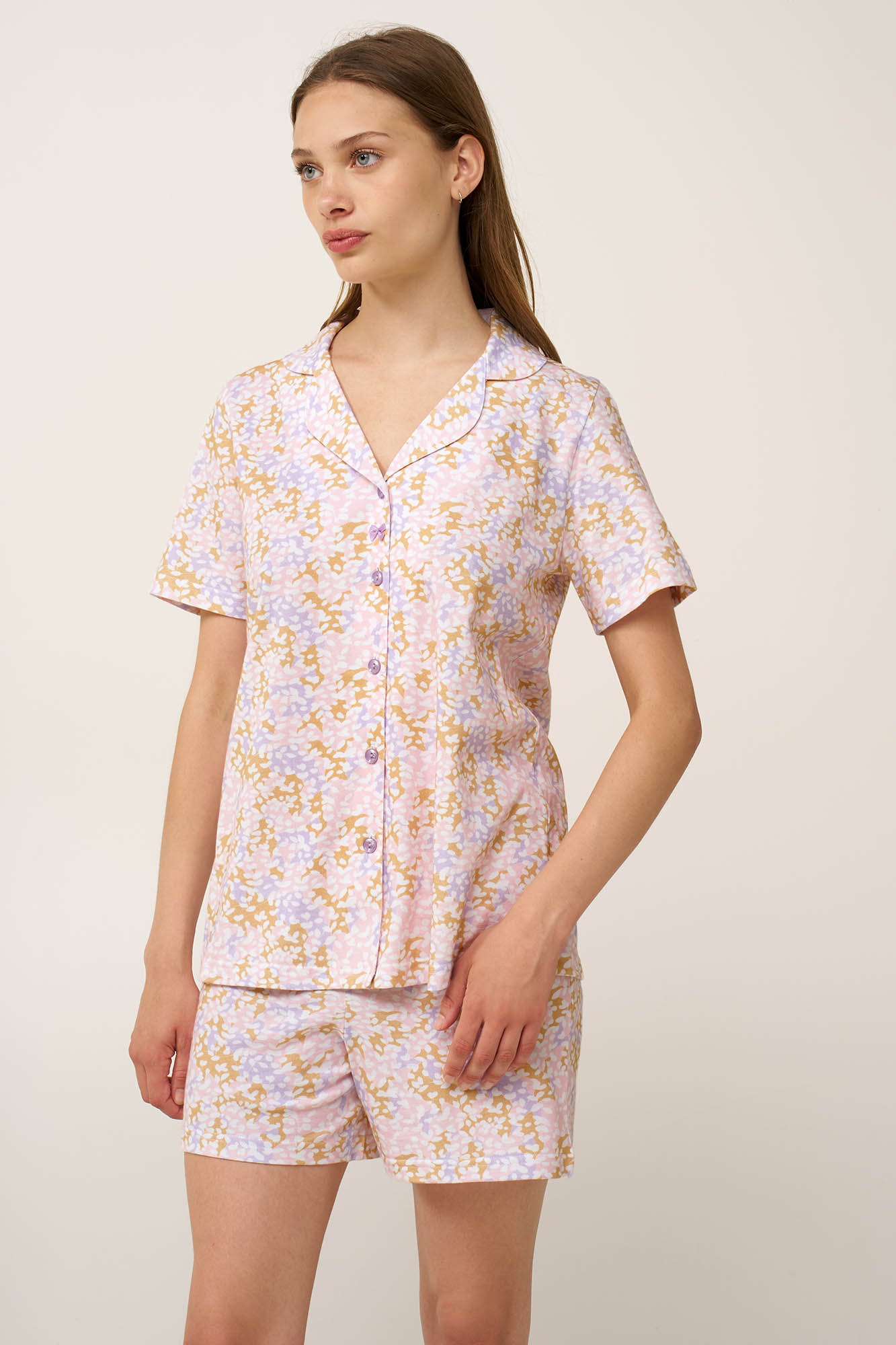 Άνετο, δροσερό και κομψό, αυτό το γυναικείο καλοκαιρινό σετ πυτζάμες είναι σχεδιασμένο για χαλαρές στιγμές στο σπίτι. Κατασκευασμένο από απαλό, διαπνέον 100% βαμβάκι single jersey, διαθέτει κλασικό κουμπωτό πάνω μέρος, σε συνδυασμό με ασορτί κοντό παντελόνι με άνετη εφαρμογή. Ιδανικό για χαλάρωση, ύπνο ή ξεκούραση στο σπίτι, το σετ αυτό συνδυάζει την καθημερινή άνεση με διαχρονική κομψότητα.