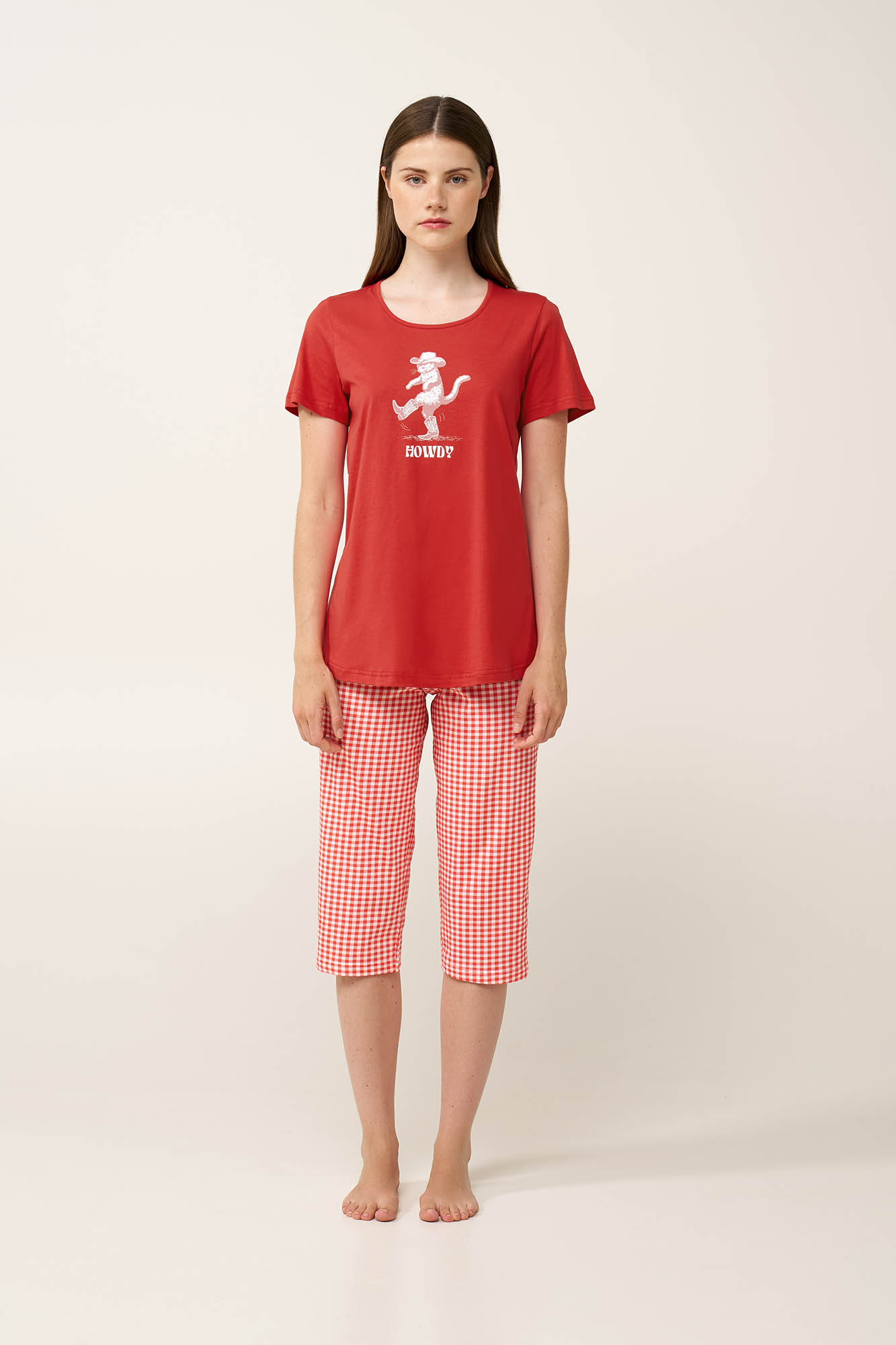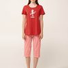 Επιλέξτε για τις στιγμές χαλάρωσης σας ένα χαρούμενο, γυναικείο σετ πυτζάμες, κατασκευασμένο από διαπνέον 100% βαμβάκι single jersey με απαλή, ανάλαφρη αίσθηση. Το κοντομάνικο τοπ προσφέρει χαλαρή και άνετη εφαρμογή και διακοσμείται με ένα παπουτσωμένο γάτο στο στήθος, που προσθέτει μια χαρούμενη, φανταστική νότα. Το κάπρι παντελόνι φέρει ένα διαχρονικό κόκκινο καρό gingham, χαρίζοντας φρέσκια vintage διάθεση και κλασικό χαρακτήρα στο look. Σχεδιασμένο για να δώσει άνεση κάθε στιγμή της ημέρας.