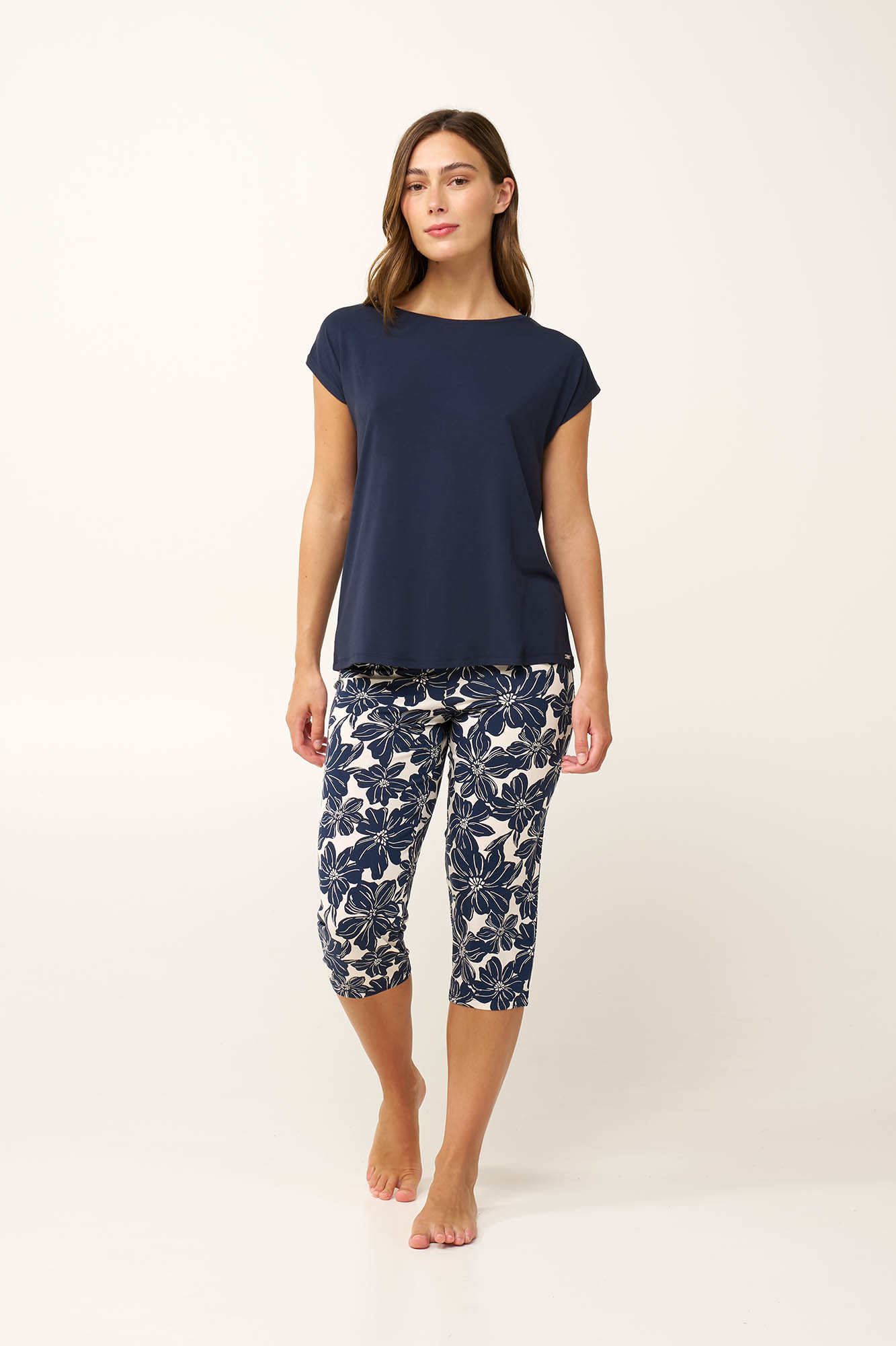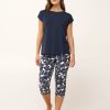 Ανανεώστε τη διάθεση σας με ένα σετ γυναικείες καλοκαιρινές πυτζάμες, κατασκευασμένο από εξαιρετικά απαλό κι διαπνέον LENZING Tencel Modal Micro. Το σετ αποτελείται από ένα μονόχρωμο, αμάνικο τοπ με χαλαρή εφαρμογή και ένα κάπρι παντελόνι με εντυπωσιακό φλοράλ μοτίβο. Ανάλαφρο, με διακριτική ελαστικότητα θα σας βοηθήσει να παραμείνετε άνετη και να απολαύσετε ένα χαλαρό πρωινό ή ένα ήρεμο απόγευμα στο σπίτι.