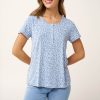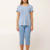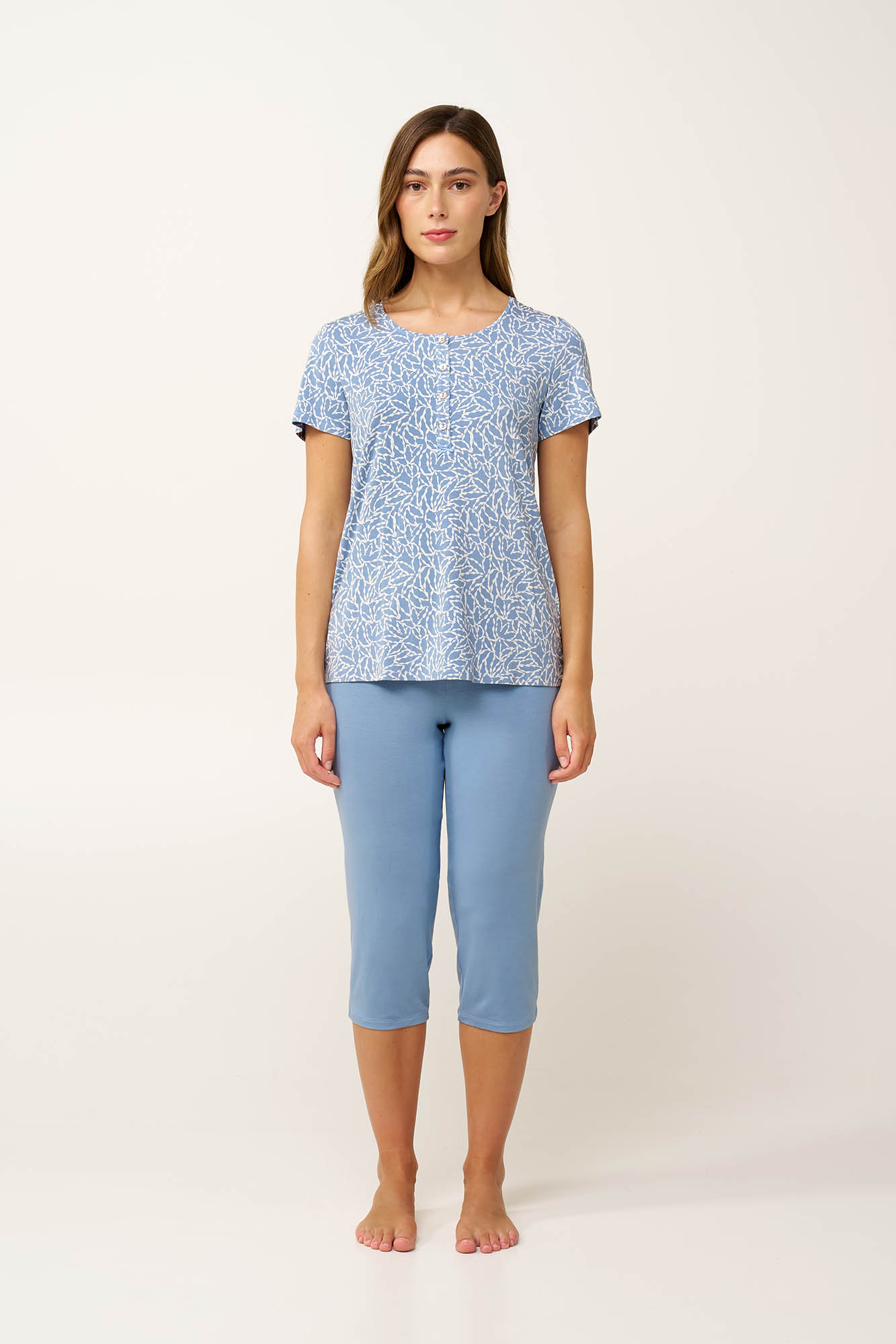 Αυτή η καλοκαιρινή γυναικεία πυτζάμα είναι μια όμορφη πρόταση με εκλεπτυσμένη θηλυκότητα και φρεσκάδα. Κατασκευασμένη από LENZING Tencel Modal Micro, χαρίζει εξαιρετικά απαλή αίσθηση στο σώμα. Αποτελείται από μπλούζα με κοντό μανίκι και πατιλέτα σε ένα μοτίβο φύλλων απαλών γαλάζιων αποχρώσεων με λευκές λεπτομέρειες. Το σετ συμπληρώνει ένα μονόχρωμο κάπρι παντελόνι που ισορροπεί το σύνολο. Μια ιδανική επιλογή για ξεκούραστες νύχτες και χαλαρά πρωινά.