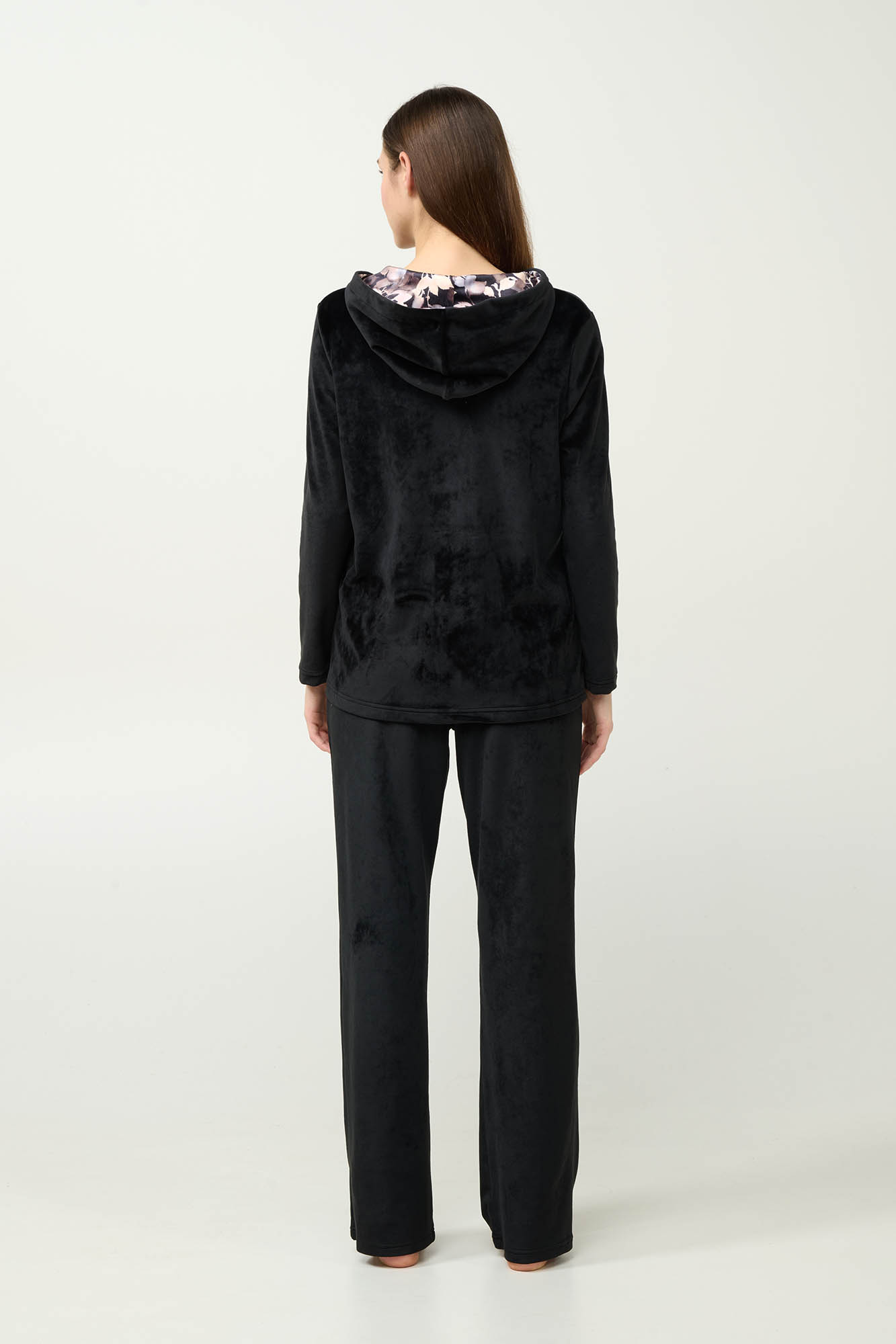 Απολαύστε την απόλυτη αίσθηση πολυτέλειας και άνεσης με αυτό το βελούδινο lounge σετ, σχεδιασμένο για να σας κρατά ζεστές και κομψές όλο τον χειμώνα. Το πάνω μέρος κλείνει με φερμουάρ ενώ διαθέτει κουκούλα και πλαϊνές τσέπες, διακοσμημένα με φλοράλ μοτίβα ακουαρέλα σε ζεστή, μοντέρνα χρωματική παλέτα. Ιδανικό για στιγμές χαλάρωσης στο σπίτι ή casual εμφανίσεις με άνεση και στυλ.