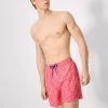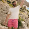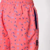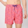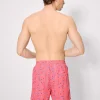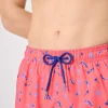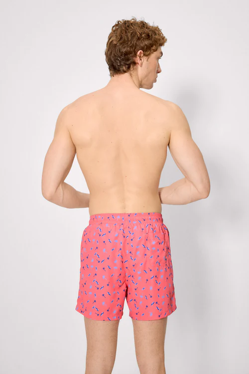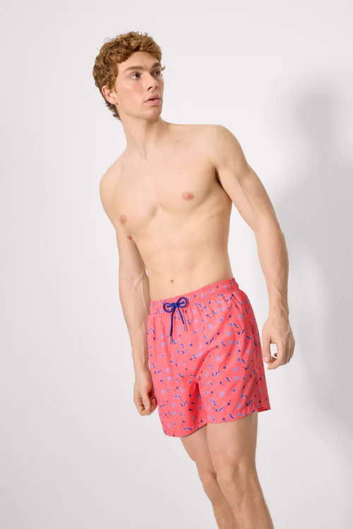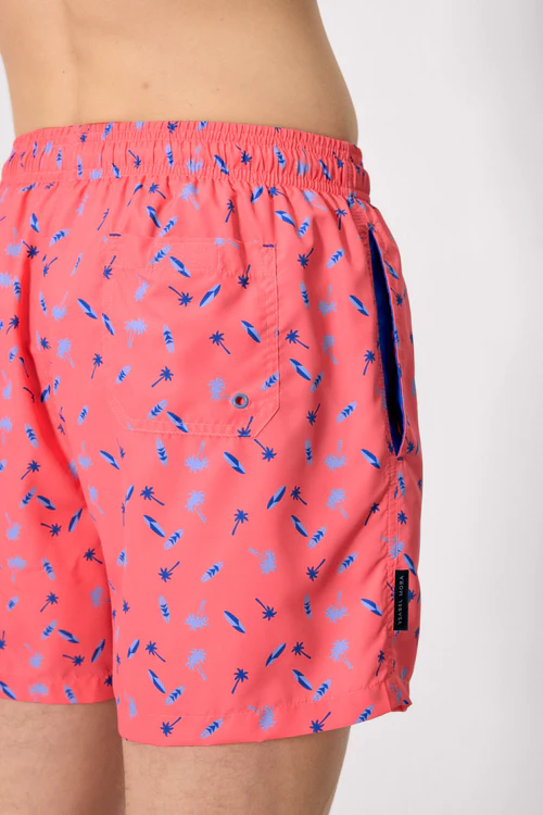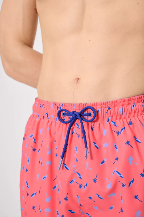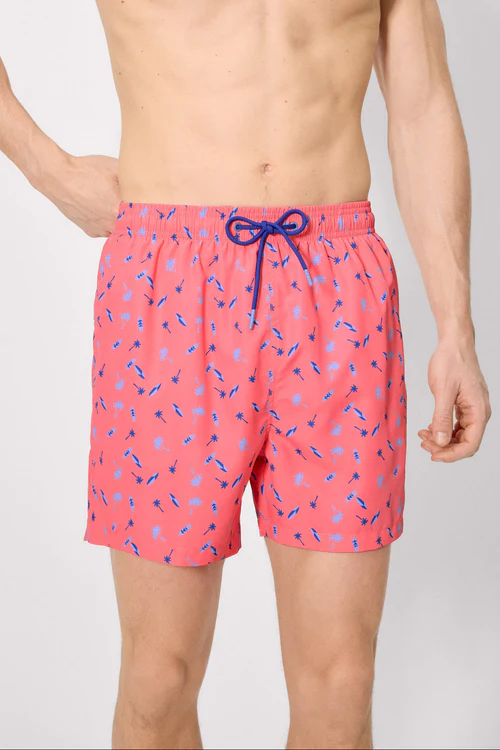 - Men’s mid-length swim trunks with a palm tree and surfboard print. Features an elasticated waistband with adjustable drawstring and functional pockets for added convenience, ideal for the beach or pool. Made with a lightweight, quick-drying fabric.