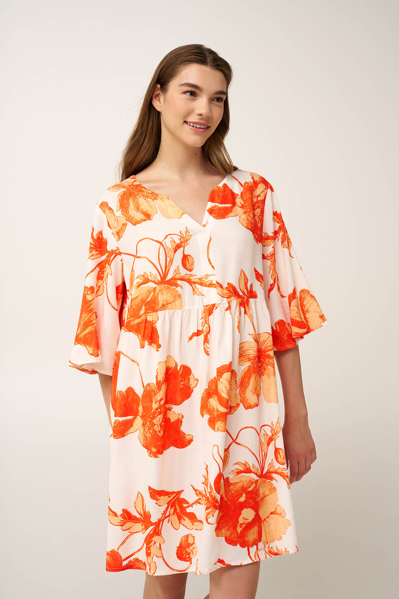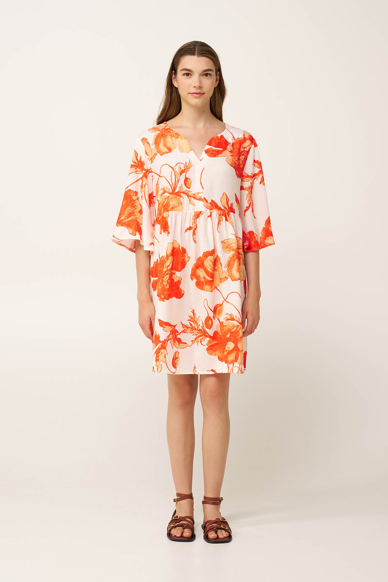 Ανανεώστε τη διάθεση σας σας με αυτό το ζωηρό καλοκαιρινό φόρεμα δροσερής ποπλίνας από ένα μείγμα viscose και λινού. Σχεδιασμένο με λαιμόκοψη V, σούρες στο μπροστινό μέρος και μανίκια που πέφτουν ανάλαφρα, κινείται φυσικά με το σώμα, ενισχύοντας την αίσθηση ελευθερίας και άνεσης. Το φωτεινό floral print σε κοραλλί αποχρώσεις χαρίζει ζωντάνια και έκφραση, κάνοντας το ιδανικό για ηλιόλουστες ημέρες που ζητούν δροσιά και χαλαρή διάθεση.
