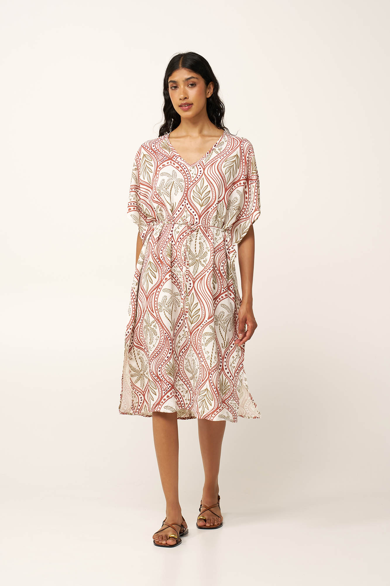 Αφεθείτε στο καλοκαιρινό αεράκι με αυτό το δροσερό φόρεμα, κατασκευασμένο από διαπνέον μείγμα ποπλίνας viscose και λινού για απαλή και ανάλαφρη αίσθηση. Σχεδισαμένο σε χαλαρή, ριχτή γραμμή, κινείται φυσικά σε κάθε σας βήμα. Ένα μοτίβο από φοινικόδεντρα με ηλιοκαμένες αποχρώσεις λαδί και τερακότας, ενισχύουν τον θερινό του χαρακτήρα. Ιδανικό για τις πιο ζεστές ημέρες των καλοκαιρινών σας διακοπών, από το πρωί στη παραλία μέχρι το απόγευμα στη βόλτα.