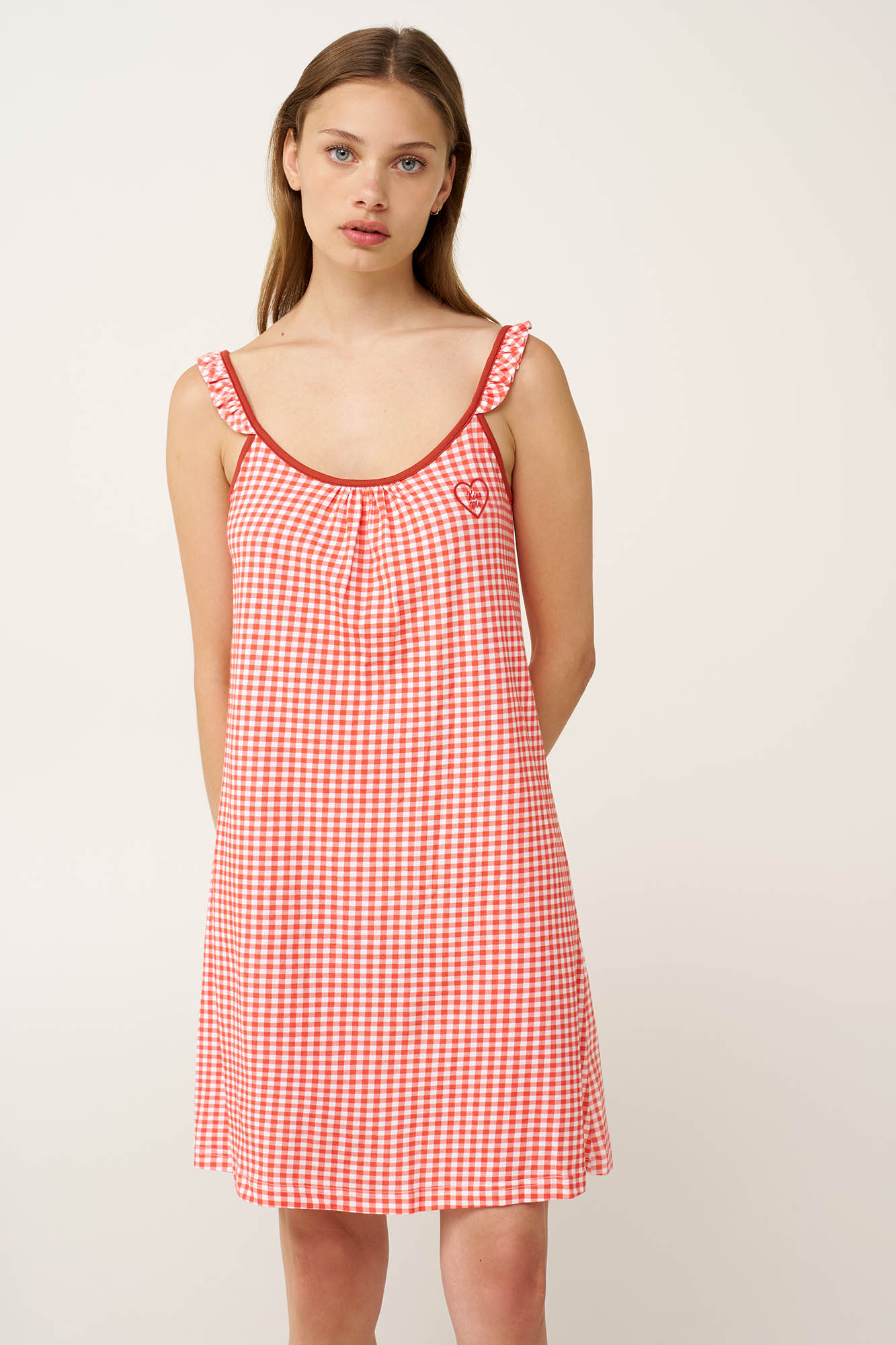 Απαλό και ανάλαφρο, αυτό το νυχτικό είναι σχεδιασμένο για χαλαρές καλοκαιρινές νύχτες και άνεση κάθε στιγμή. Κατασκευασμένο από διαπνέον 100% βαμβάκι single jersey, προσφέρει ευχάριστη, δροσερή αίσθηση στο δέρμα, ενώ το διαχρονικό κόκκινο καρό gingham χαρίζει μια ζεστή, οικεία νότα με φρέσκο χαρακτήρα Λεπτές τιράντες με βολάν και διακριτικές σούρες στο στήθος χαρίζουν ρομαντισμό και γοητεία που θα απολαύσετε τις πιο ζεστές ημέρες του καλοκαιριού.