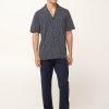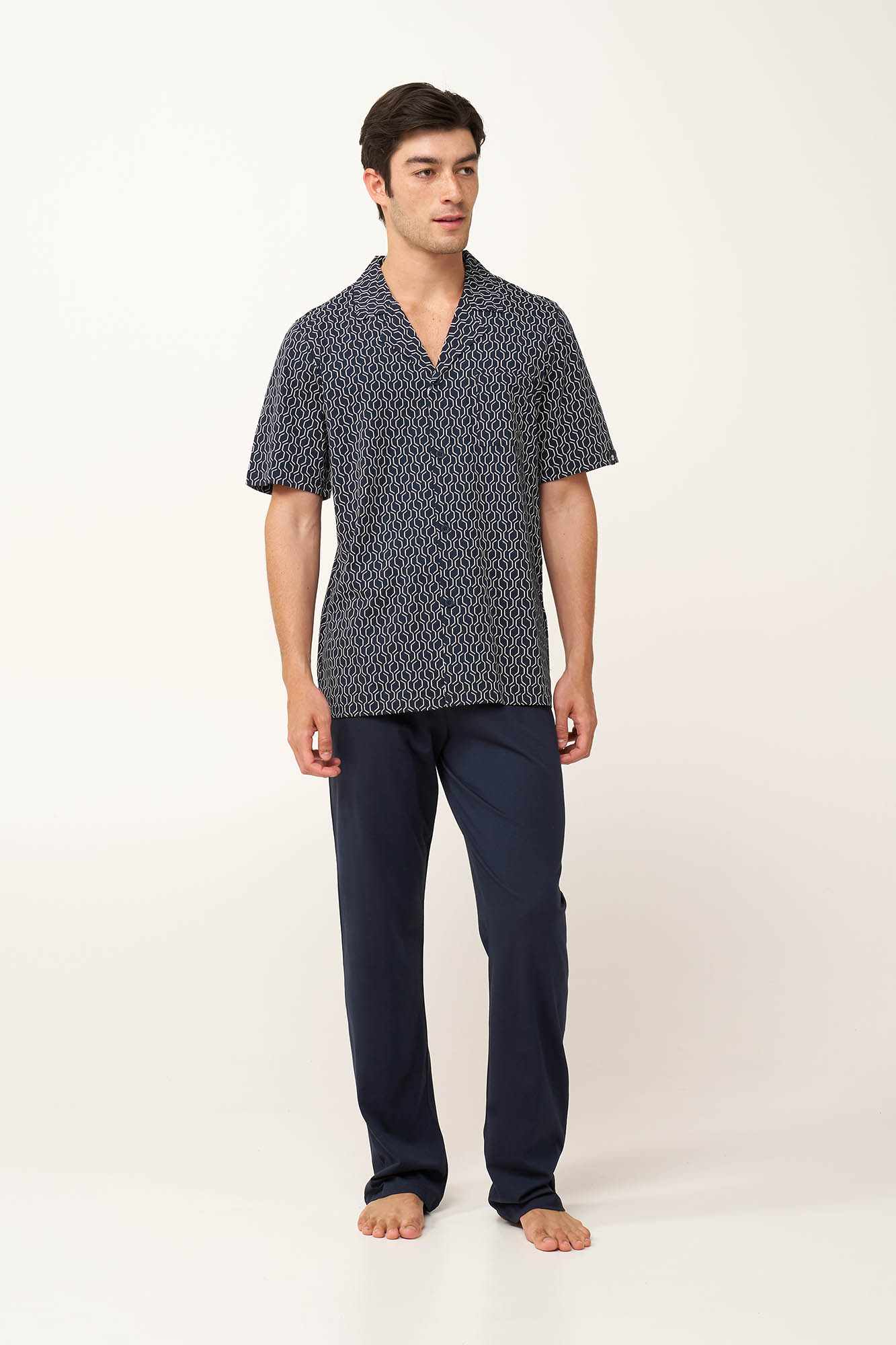 Απολαύστε χαλαρά καλοκαιρινά βράδια με αυτό το ανδρικό σετ πυτζάμες, κατασκευασμένο από απαλό και δροσερό 100% βαμβάκι single jersey που χαρίζει ευχάριστη αίσθηση στο δέρμα. Αποτελείται από κουμπωτό πάνω μέρος με γεωμετρικό μοτίβο κυμάτων, που προσφέρει μια μοντέρνα πινελιά στο κλασικό, διαχρονικό ύφος, ενώ ένα μονόχρωμο μακρύ παντελόνι εξασφαλίζει άνεση. Ιδανικό για στιγμές χαλάρωσης ή δροσερά βράδια στη βεράντα.