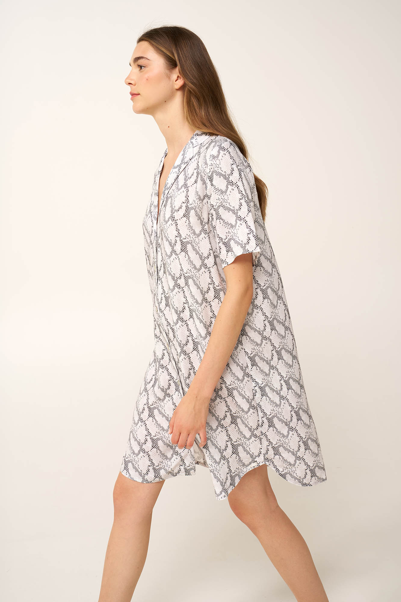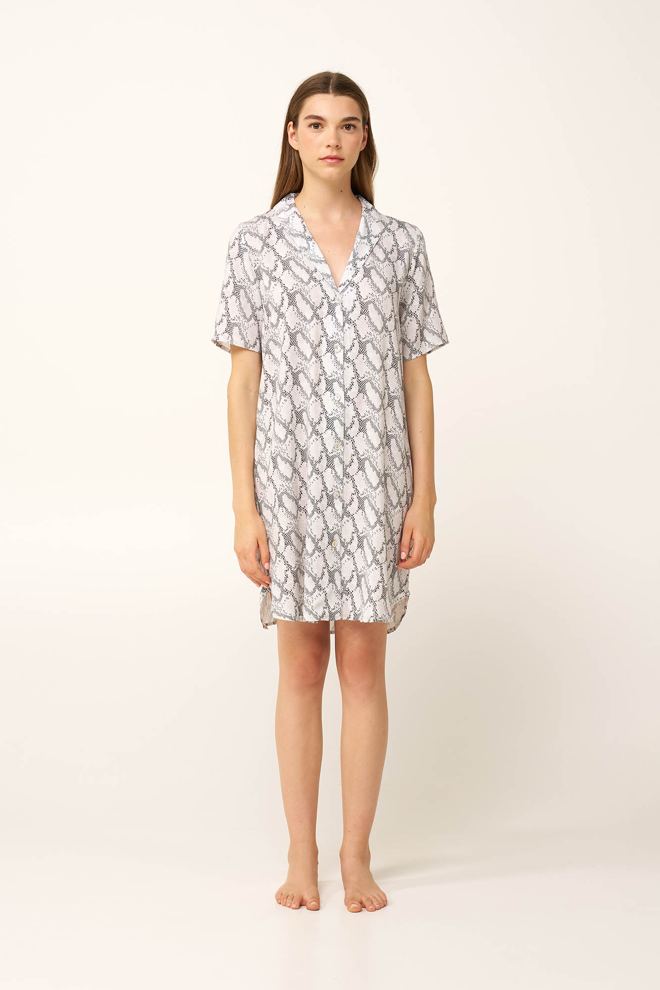 Ανεπιτήδευτα κομψό και ιδανικό για το καλοκαίρι, αυτό το νυχτικό είναι κατασκευασμένο από 100% viscose ποπλίνα, χαρίζοντας ανάλαφρη και δροσερή αίσθηση στις ζεστές ημέρες. Σχεδιασμένο με κοντά μανίκια και κλασικό κουμπωτό μπροστινό μέρος σε χαλαρή, είναι διακοσμημένο από ένα snake print που προσθέτει μια νότα αισθησιασμού. Φρέσκο, αέρινο και άνετο, είναι ιδανικό τόσο για ξεκούραστο ύπνο όσο και για χαλαρές στιγμές στο σπίτι γεμάτες αυτοπεποίθηση.