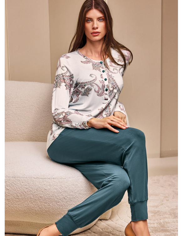 Crafted from soft heavy viscose, it feels silky and smooth on the skin. The serafino top with a refined paisley print and cuffed long pants combine sophistication and practicality.