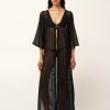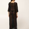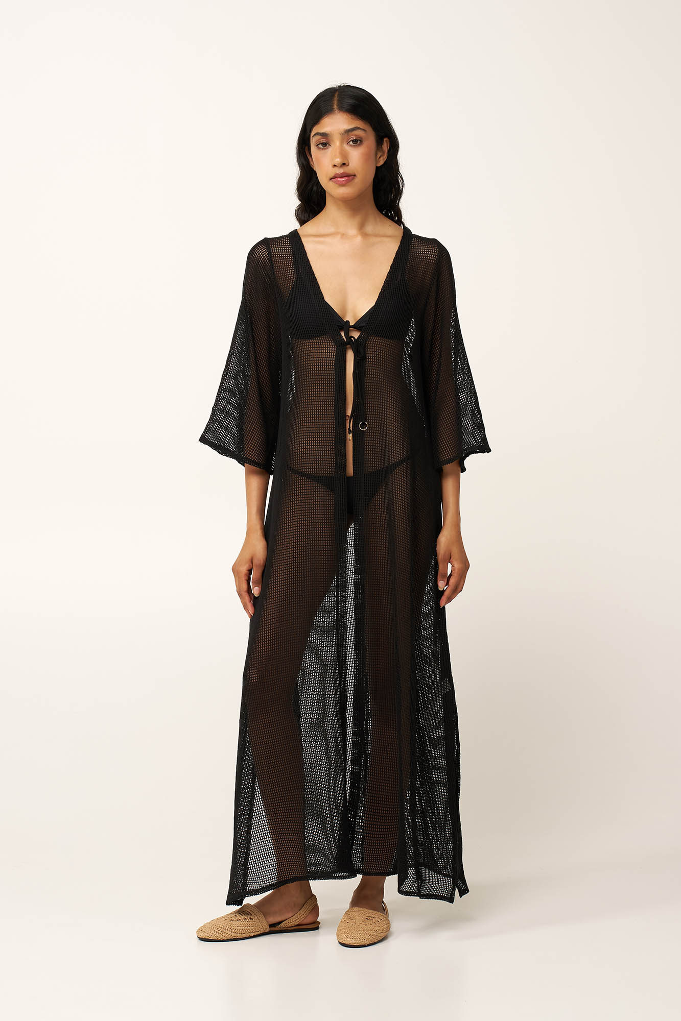 Αφεθείτε στην απόλυτη καλοκαιρινή άνεση με αυτό το τολμηρό maxi φόρεμα παραλίας από μαύρο, διάφανο mesh ύφασμα, που πέφτει φυσικά πάνω στο σώμα, ενώ τα μακριά, χαλαρά μανίκια και το δέσιμο στο στήθος προσφέρουν διακριτική διαμόρφωση και κίνηση. Σχεδιασμένο για να φορεθεί πάνω από μαγιό ή μόνο του με αυτοπεποίθηση, συνδυάζει τολμηρή διαφάνεια με καθαρές, απλές γραμμές — ιδανικό για ηλιόλουστες ημέρες στην παραλία ή χαλαρά βράδια δίπλα στη θάλασσα.