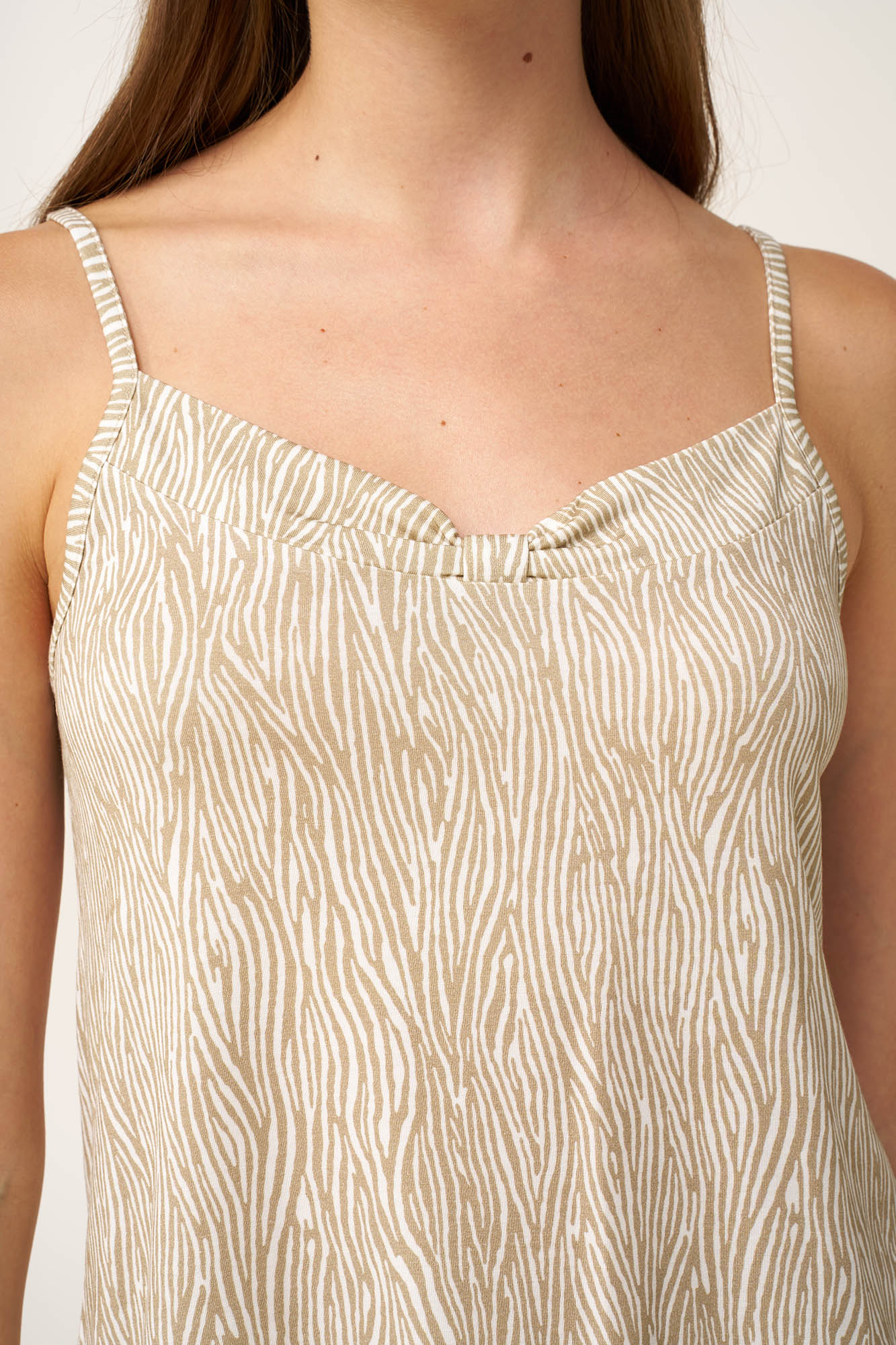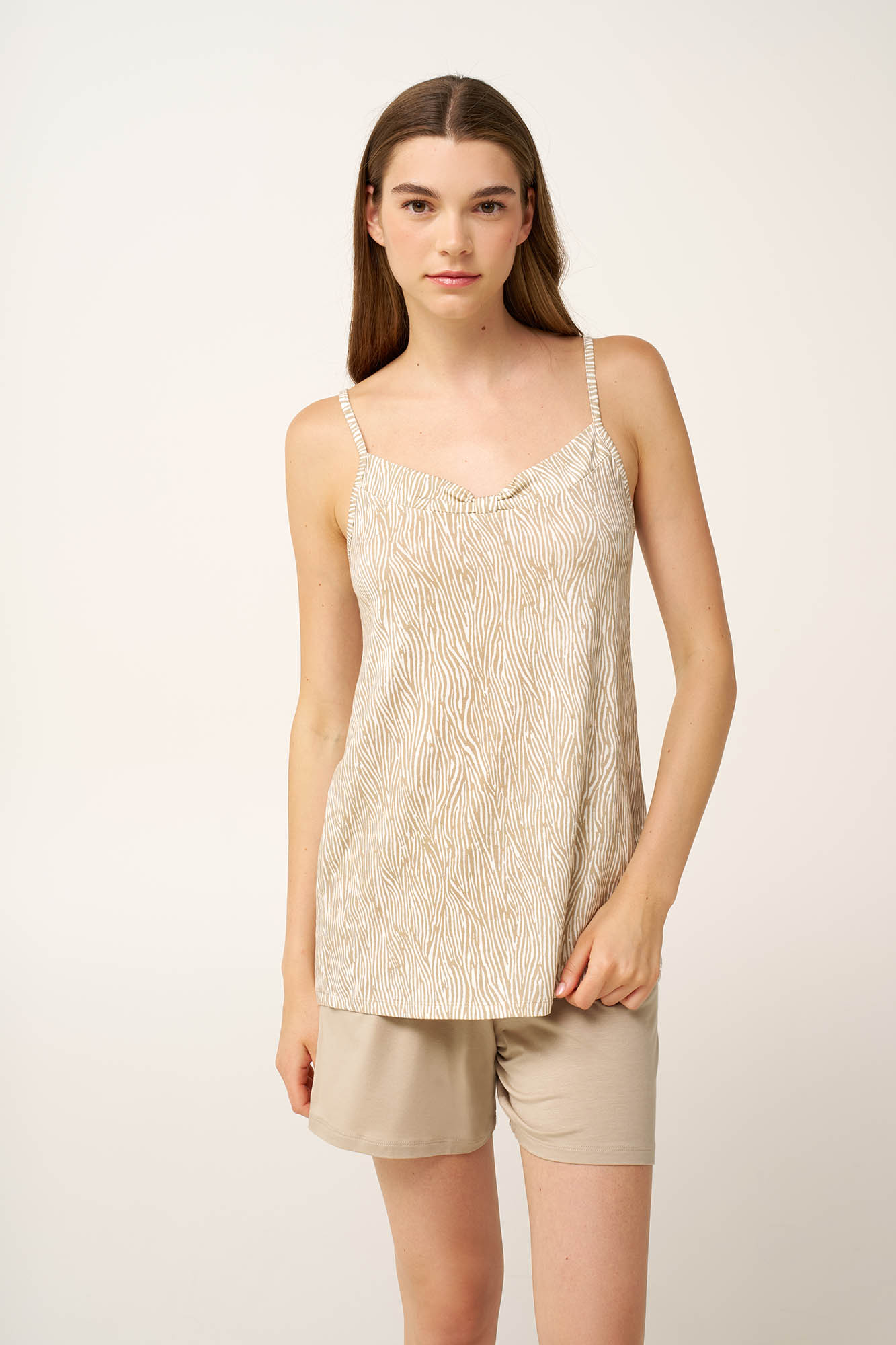 Αφεθείτε στην απόλυτη άνεση με ένα babydoll κατασκευασμένο από LENZING Tencel Modal Micro, που προσφέρει απαλή, ανάλαφρη και διαπνέουσα αίσθηση. Το τοπ με κομψό ζέβρα μοτίβο και λεπτές τιράντες συνδυάζεται με μονόχρωμο κοντό παντελόνι Ιδανικό για χαλάρωση στο σπίτι ή τον βραδινό ύπνο, εξασφαλίζει απαλότητα και ελευθερία κινήσεων, αναδεικνύοντας τη θηλυκή σας πλευρά..