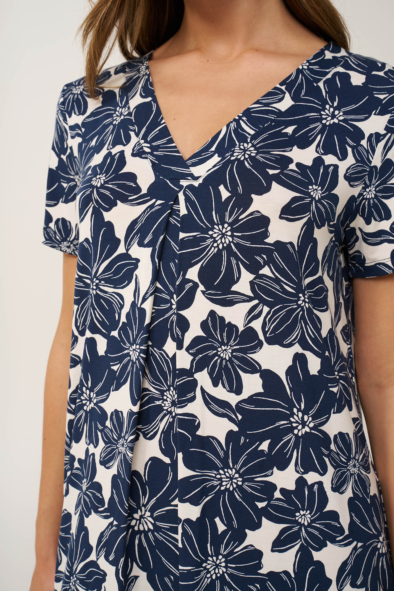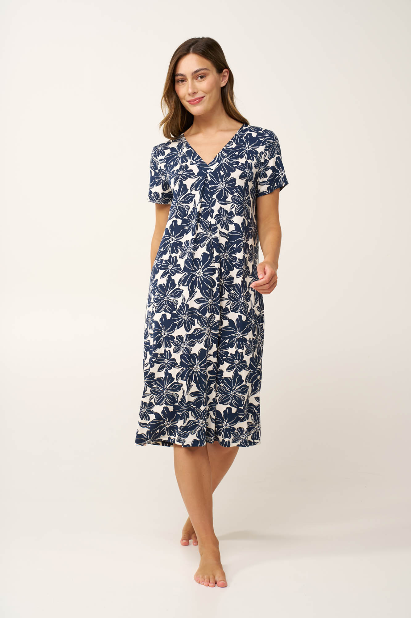Ανακαλύψτε ευχάριστη αίσθηση που μπορεί να σας προσφέρει ένα απαλό και διαπνέον νυχτικό, κατασκευασμένο από LENZING Tencel Modal Micro. Σχεδιασμένο με κοντά μανίκια, θηλυκή V λαιμόκοψη και πιέτα στο μπροστινό μέρος που χαρίζει χαλαρή εφαρμογή και ελευθερία κινήσεων. Διακοσμημένο με ένα εντυπωσιακό μπλε φλοράλ print, αυτό το νυχτικό συνδυάζει ιδανικά άνεση και φρεσκάδα για να απολαύστε κάθε στιγμή χαλάρωσης στο σπίτι ή τις διακοπές σας.