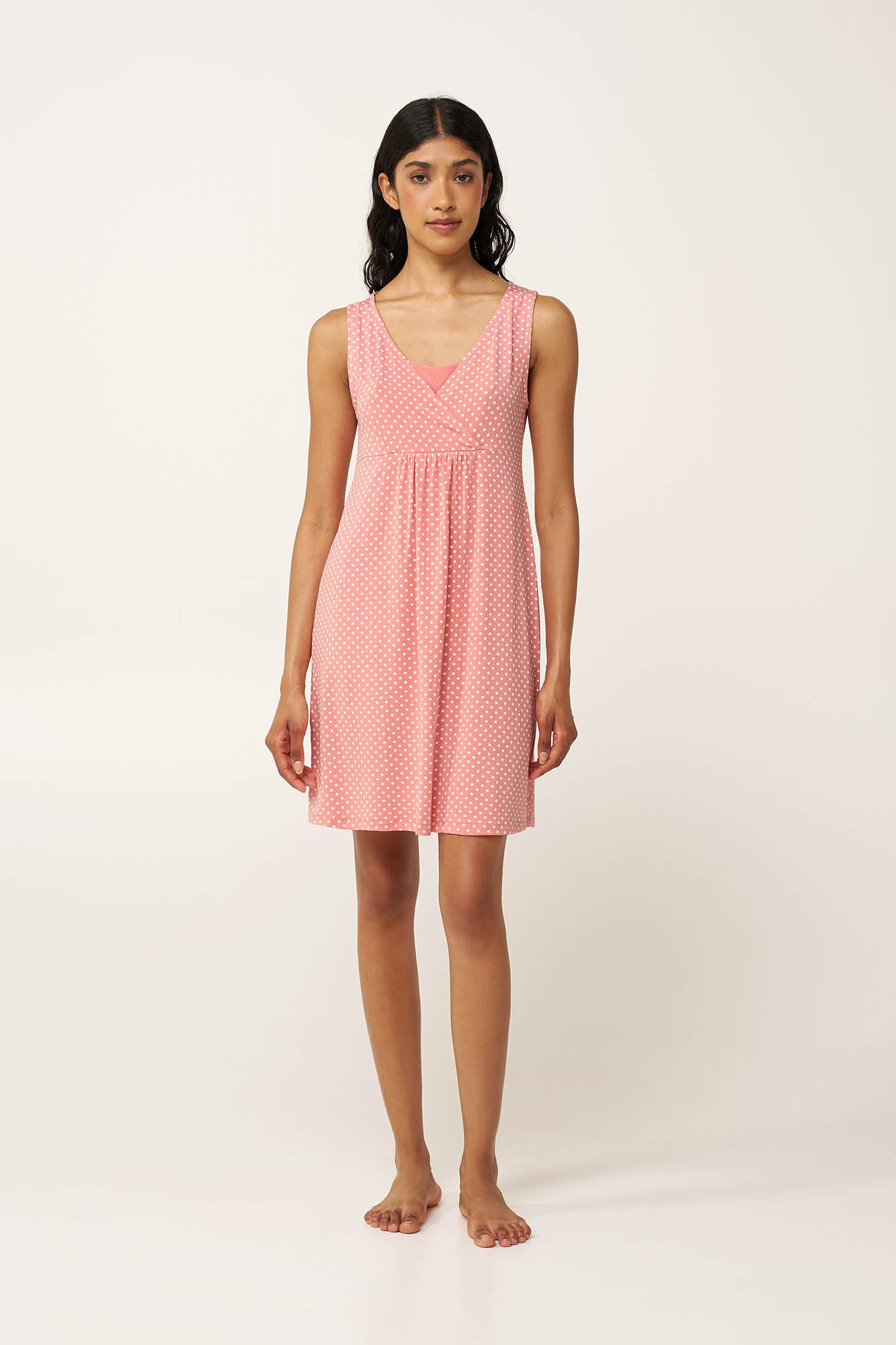 Επιλέξτε αυτό το νυχτικό εγκυμοσύνης και θηλασμού, με κλασικό λευκό πουά μοτίβο σε απαλό ροζ καμβά για μια ρομαντική, vintage αίσθηση. Κατασκευασμένο από ελαστικό και εξαιρετικά απαλό LENZING Tencel Modal Micro, αγκαλιάζει το σώμα με άνεση, ενώ η λαιμόκοψη του ανοίγει στο στήθος για να διευκολύνει τον θηλασμό. Τα κοντά μανίκια και το δροσερό ύφασμα προσφέρουν ευχάριστη αίσθηση τις ζεστές καλοκαιρινές νύχτες, ενώ οι σούρες στο μπροστινό μέρος εξασφαλίζουν πιο χαλαρή εφαρμογή στην περιοχή της κοιλιάς. Μια πρακτική και διαχρονική επιλογή για στιγμές χαλάρωσης και φροντίδας.