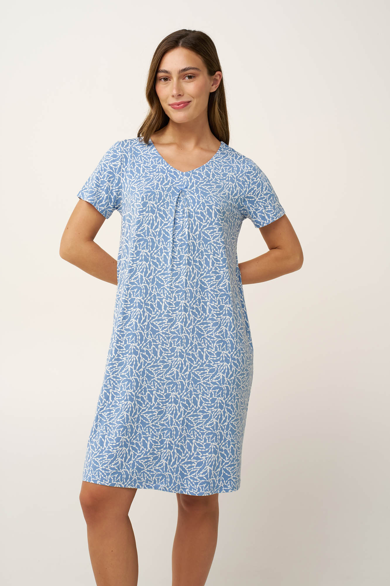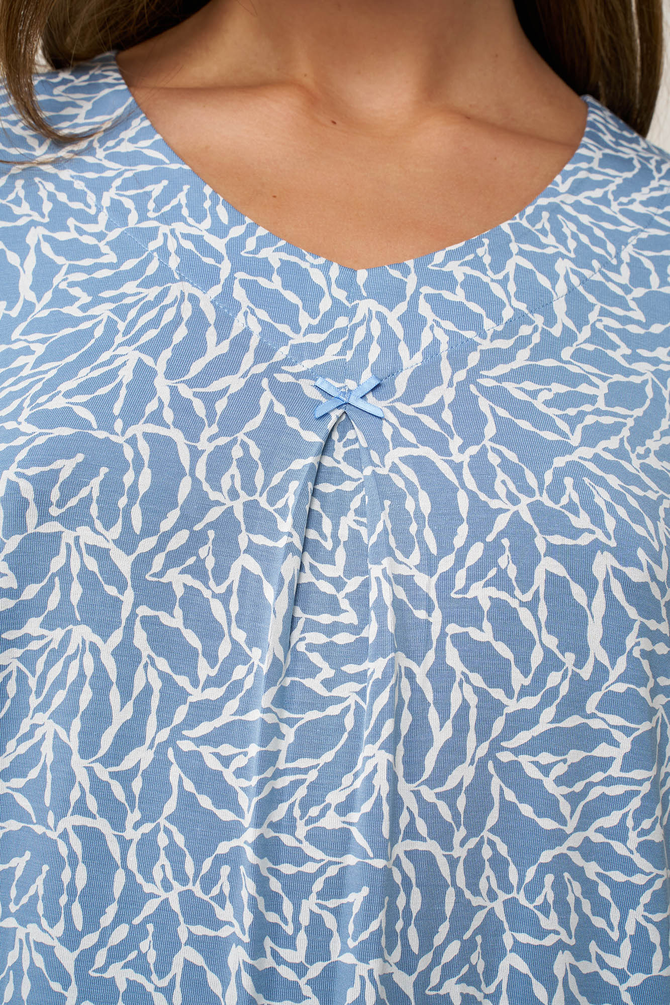Ανανεώστε τη συλλογή σας με αυτό το καλοκαιρινό νυχτικό, κατασκευασμένο από μεταξένια απαλό LENZING Tencel Modal Micro για δροσερή και ανάλαφρη αίσθηση. Τα κοντά μανίκια και η διακριτική πιέτα στο στήθος δημιουργούν χαλαρή, άνετη εφαρμογή που ακολουθεί το σώμα με φυσική ροή. Το θηλυκό μοτίβο φύλλων σε μπλε αποχρώσεις και καθαρές λευκές λεπτομέρειες χαρίζει αέρινη κομψότητα και καλοκαιρινή φρεσκάδα.. Ιδανικό για χαλάρωση στο σπίτι ή ξεκούραστο ύπνο.