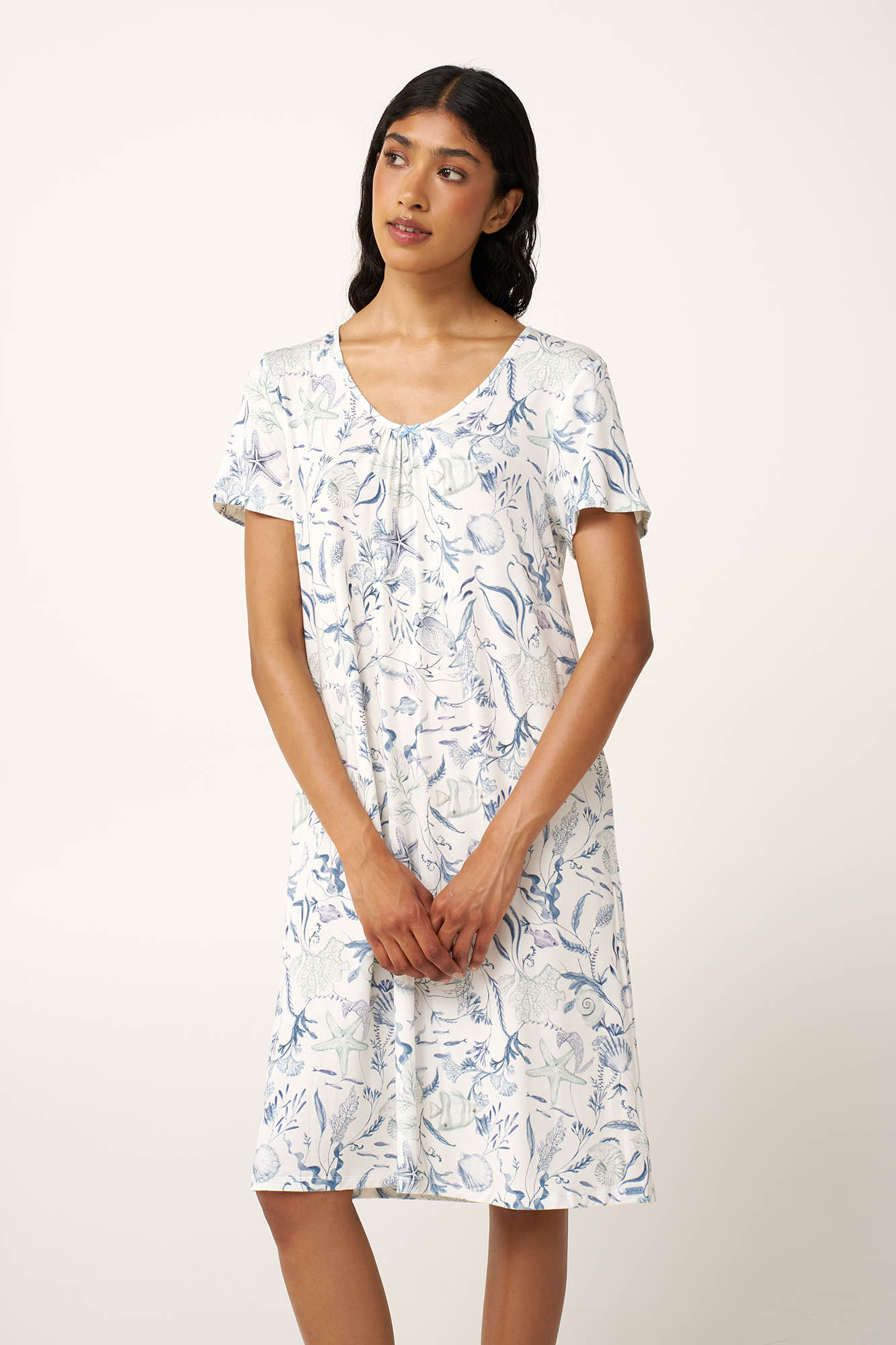 Αφεθείτε στην άνεση που μπορεί να σας προσφέρει ένα δροσερό νυχτικό, εμπνευσμένο από τον ήρεμο κόσμο της θάλασσας. Το αέρινο, ζωγραφισμένο στο χέρι μοτίβο με κοράλλια, κοχύλια και φυτά του βυθού, δημιουργεί μια χαλαρωτική, καλοκαιρινή αίσθηση. Κατασκευασμένο από LENZING Tencel Modal Micro, προσφέρει διαπνέουσα και απαλή αίσθηση στο δέρμα. Οι διακριτικές σούρες στο στήθος χαρίζουν μια θηλυκή νότα, ενώ τα κοντά μανίκια και η χαλαρή γραμμή εξασφαλίζουν άνεση και ελευθερία κινήσεων. Ιδανικό για κάθε στιγμή.