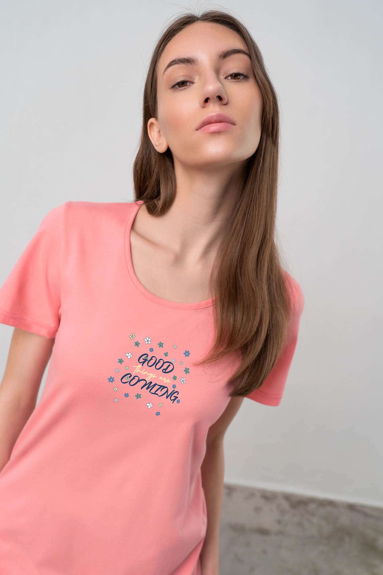 Μονόχρωμο νυχτικό με διακριτικό τύπωμα στο στήθος και στρογγυλή λαιμόκοψη. Ένα δροσερό νυχτικό από βαμβάκι, ιδανικό για το καλοκαίρι.