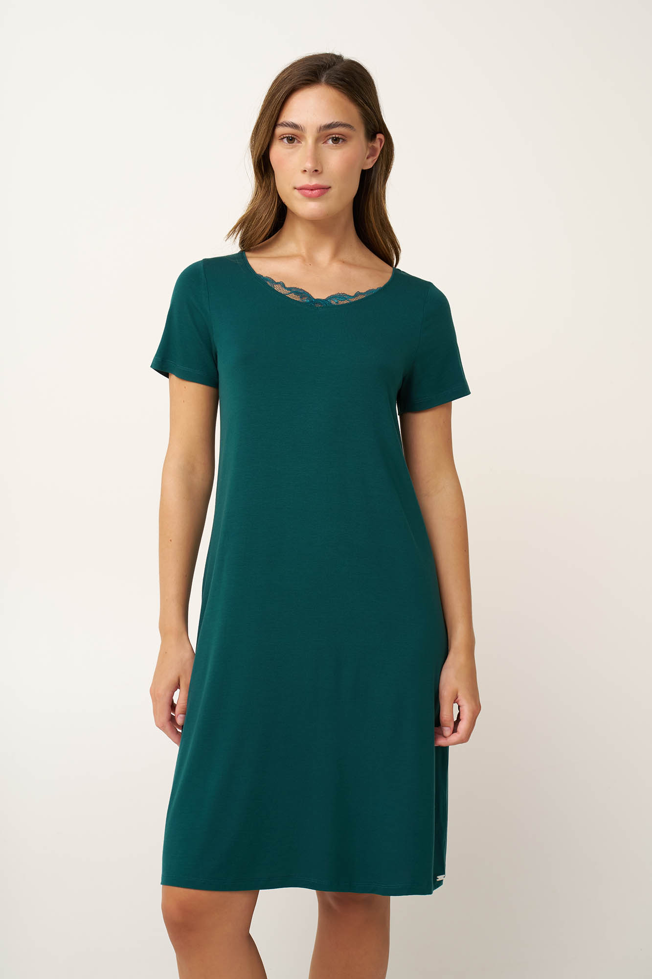 Απολαύστε την άνεση που προσφέρει αυτό το καλοκαιρινό νυχτικό, κατασκευασμένο από ένα μείγμα LENZING Tencel Modal Micro και elastane, που προσφέρει ανάλαφρη και διαπνέουσα αίσθηση. Σχεδιασμένο με κοντά μανίκια και διακριτική δαντέλα στη λαιμόκοψη, συνδυάζει θηλυκότητα και διαχρονική κομψότητα. Μια μεταξένια απαλή επιλογή για να απολαύσετε κάθε στιγμή του καλοκαιρίου.