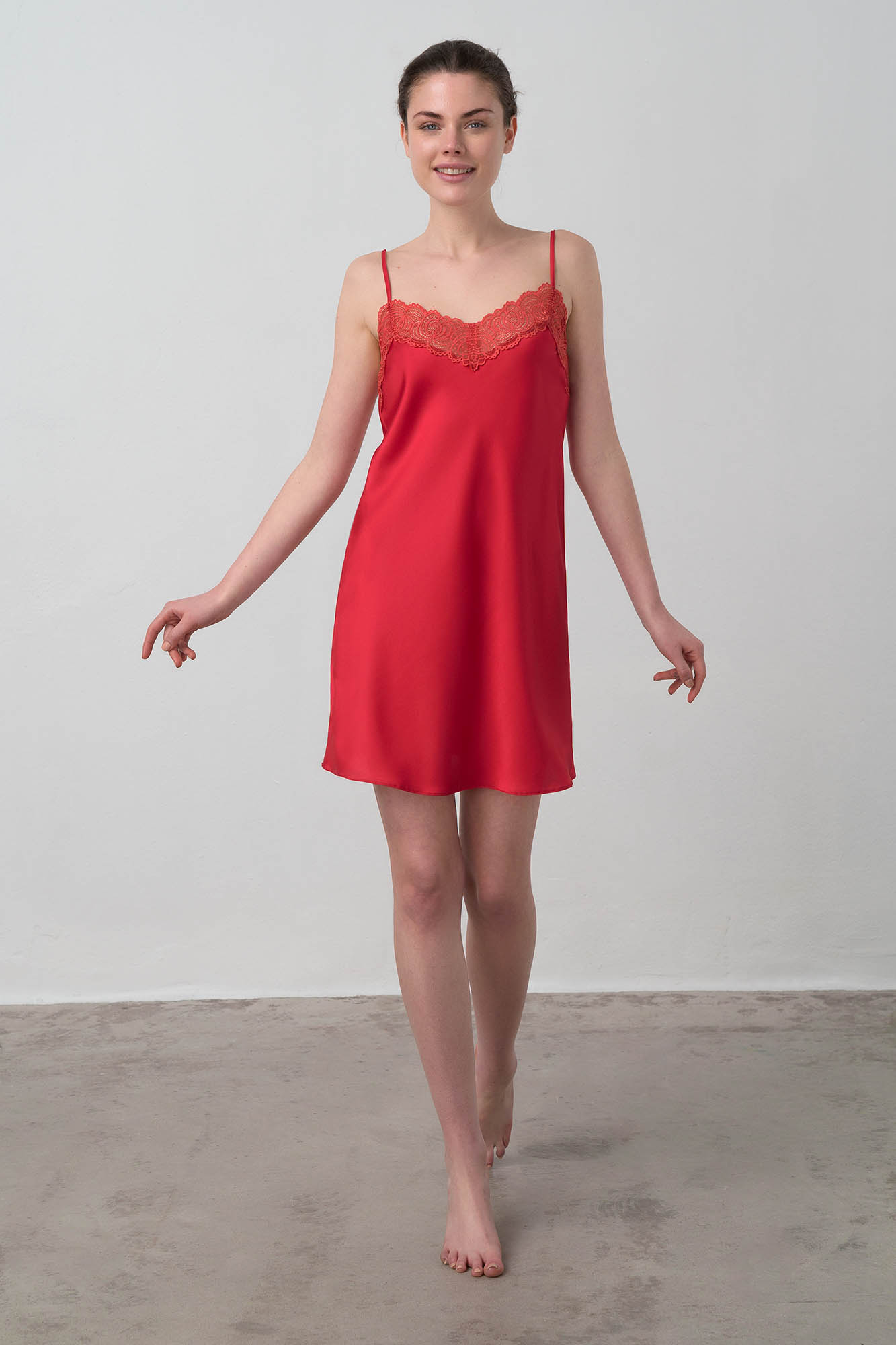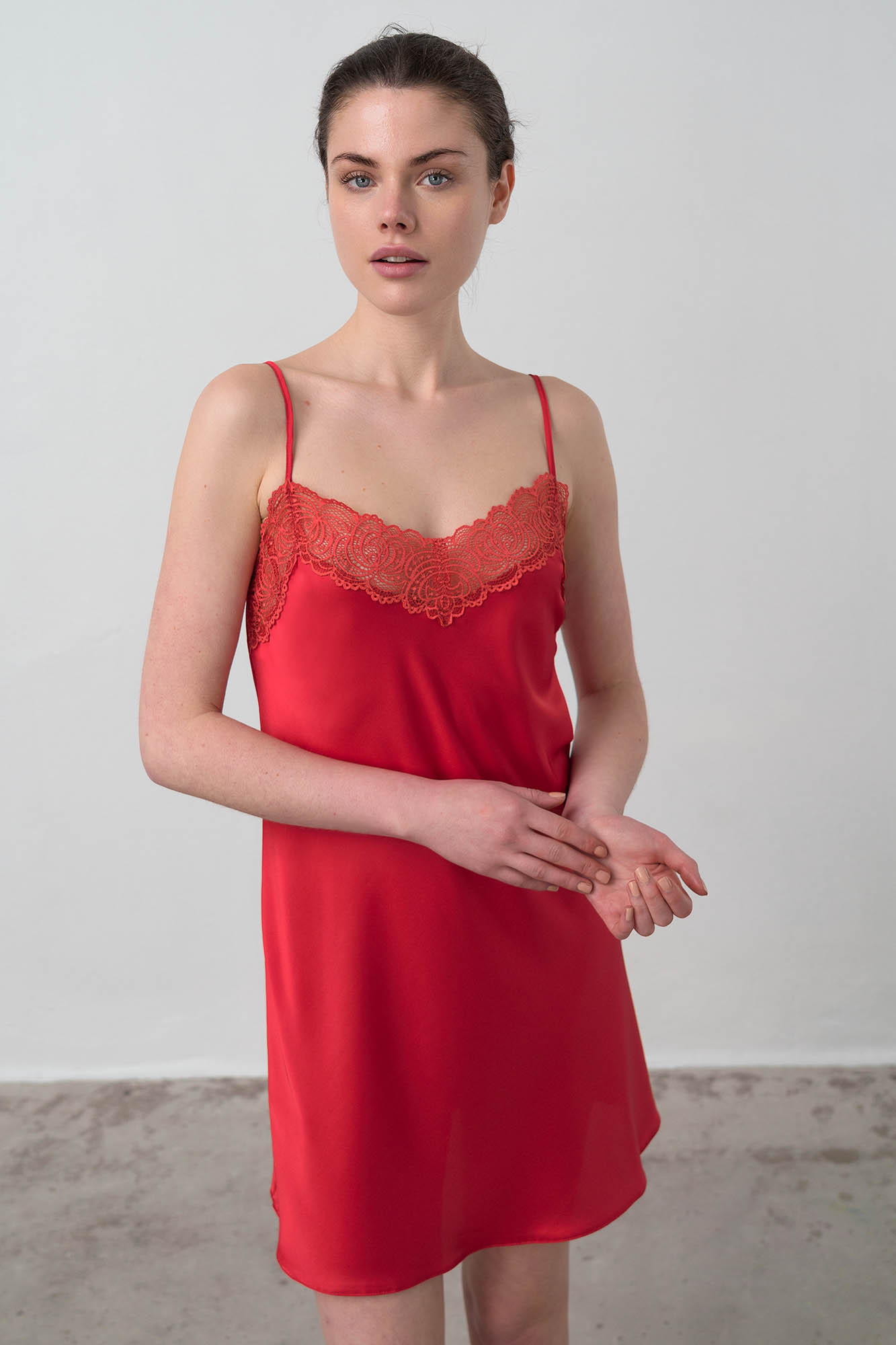 Μονόχρωμο νυχτικό με λεπτές τιράντες και διακοσμητική δαντέλα στο στήθος. Ένα ρομαντικό νυχτικό από απαλό ύφασμα.