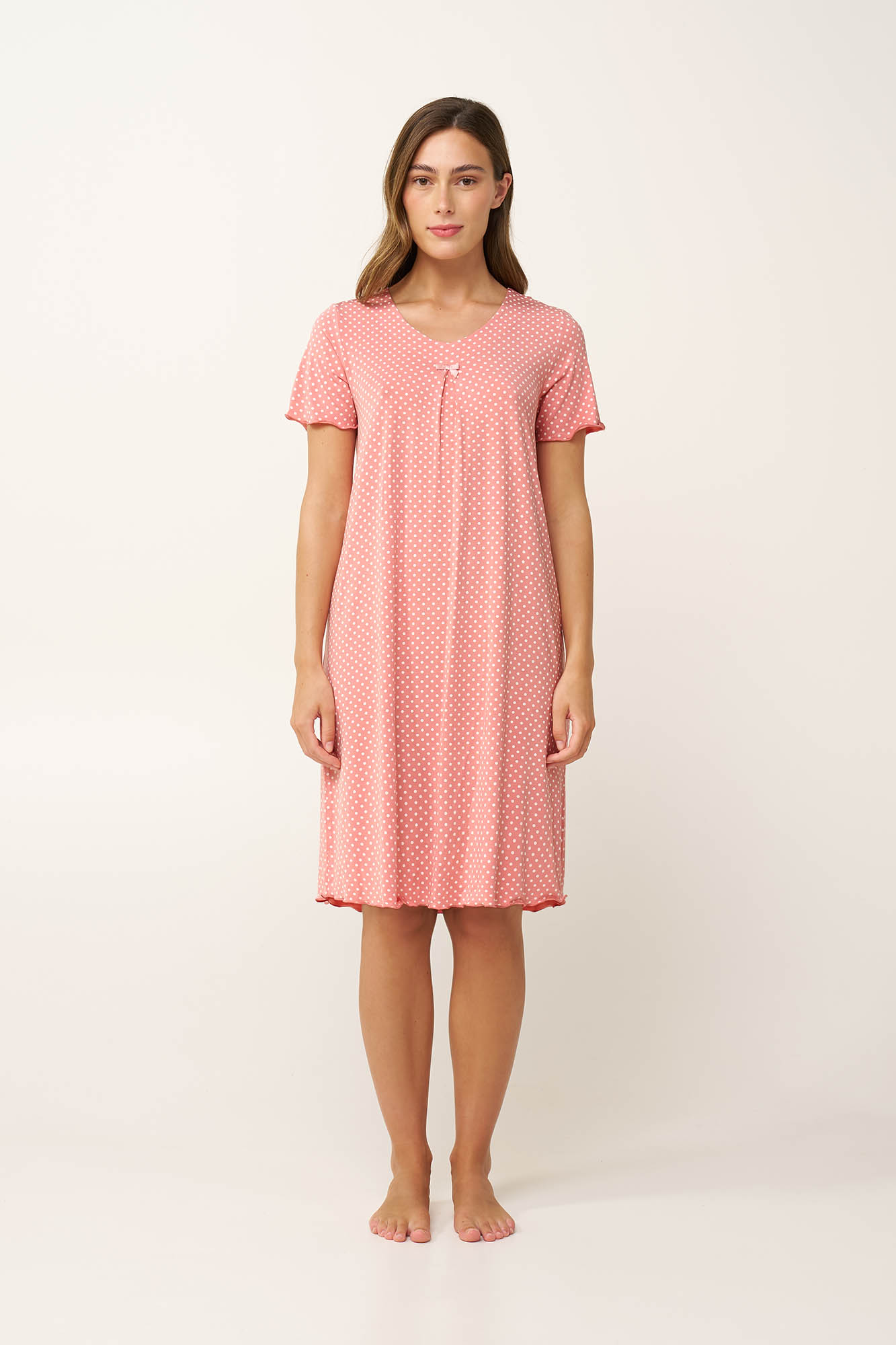 Τις ζεστές καλοκαιρινές νύχτες, αφεθείτε στην ανάλαφρη αίσθηση, που προσφέρει αυτό το γοητευτικό νυχτικό, κατασκευασμένο από εξαιρετικά απαλό και δροσερό LENZING Tencel Modal Micro. Το κλασικό λευκό πουά πάνω σε ροζ φόντο χαρίζει μια παιχνιδιάρικη, vintage κομψότητα, ιδανική για το καλοκαίρι. Τα κοντά μανίκια και η πιέτα στο μπροστινό μέρος προσφέρουν άνεση και ελευθερία κινήσεων, ενώ η διακριτική ελαστικότητα του υφάσματος εξασφαλίζει ευχάριστη εφαρμογή. Ιδανικό τόσο για στιγμές χαλάρωσης ή έναν ήρεμο, ξεκούραστο ύπνο.