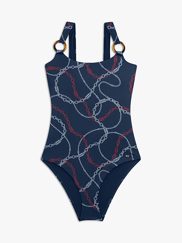 • Make a splash in this Riviera-inspired printed swimsuit featuring a duo of faux tortoiseshell rings and a flattering low scoop back.