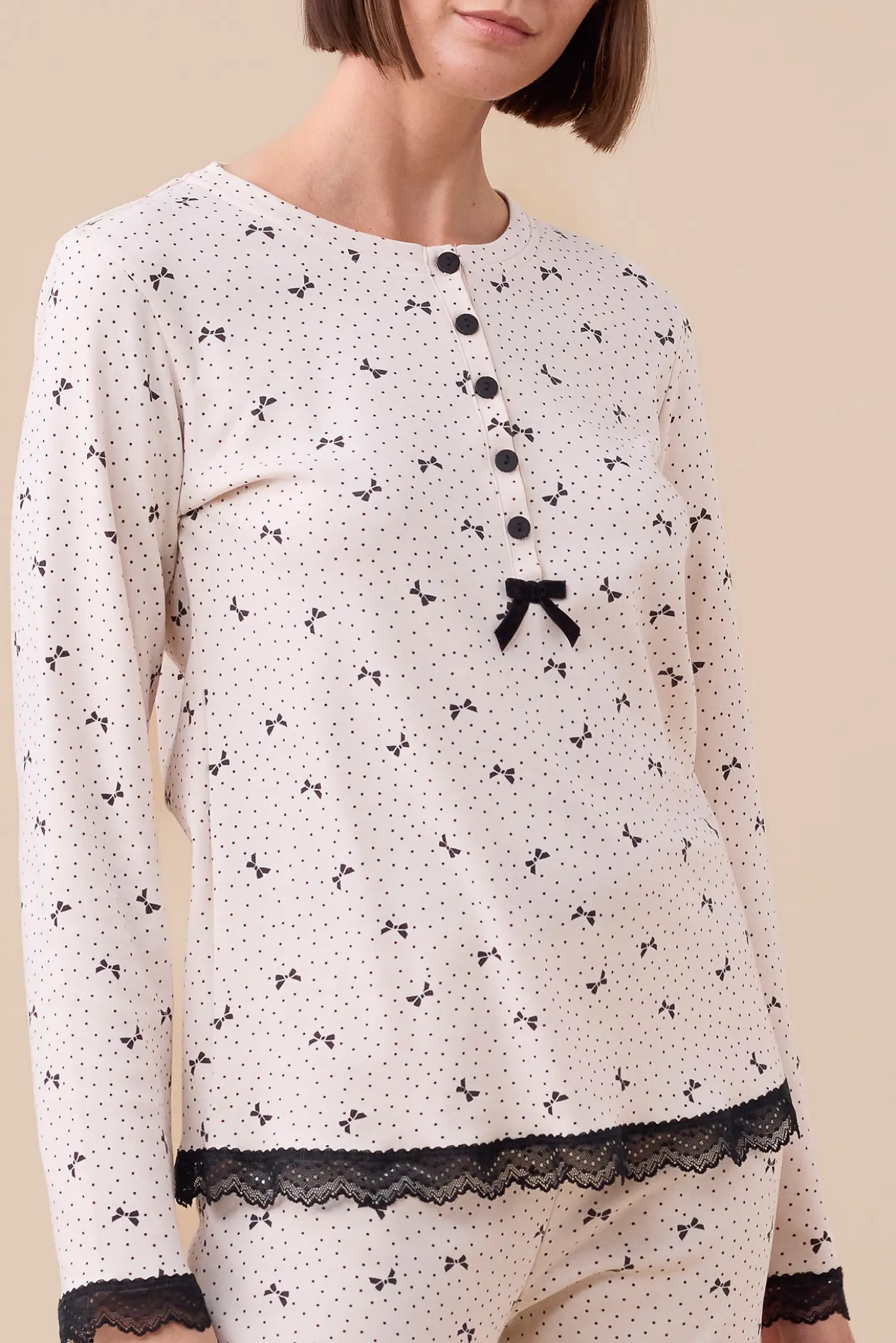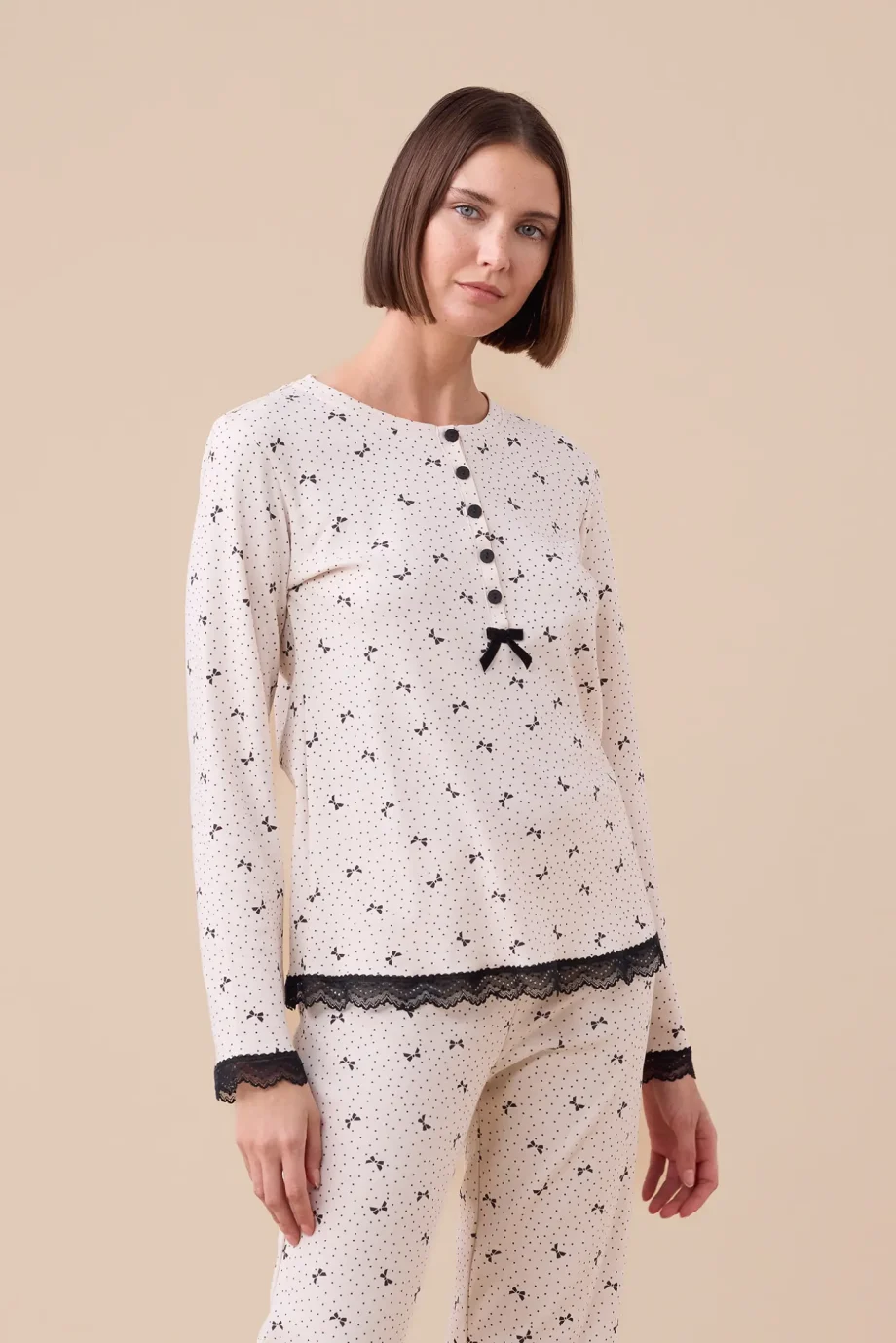 - Σετ πυτζάμα από βαμβάκι εξαιρετικής ποιότητας, που αποπνέει άνεση και αίσθημα ζεστασιάς. Μπλούζα μακρυμάνικη με πατιλέτα 4 κουμπιών και chic φιογκάκι στο κάτω μέρος. Παντελόνι μακρύ με μαλακό λάστιχο στη μέση. Polka dot και Bowa σχέδια σε όλη την επιφάνεια και περίτεχνη δαντέλα στα τελειώματα.