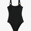 - Make waves at the pool in this timeless swimsuit, featuring a deep scoop back and branded rings for a chic look.