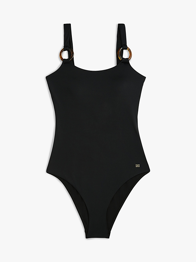 - Make waves at the pool in this timeless swimsuit, featuring a deep scoop back and branded rings for a chic look.