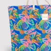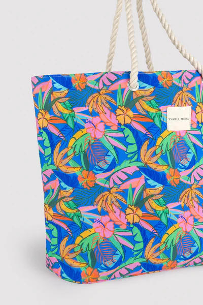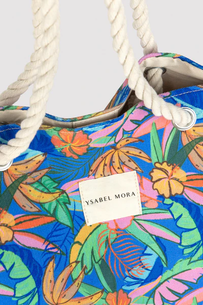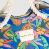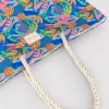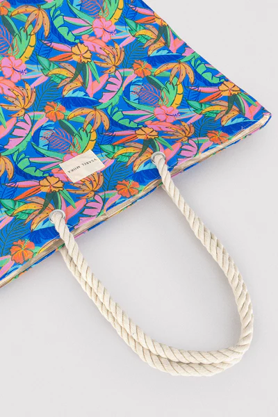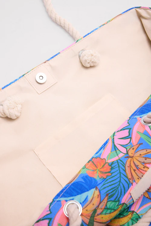 - Beach bag with rope handles. Large capacity design with a vibrant tropical print. Includes nautical-style handles for a classic summer touch.